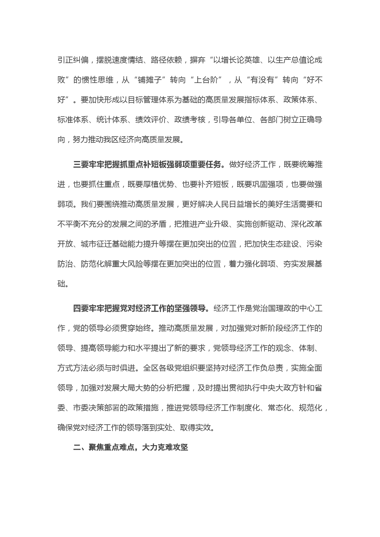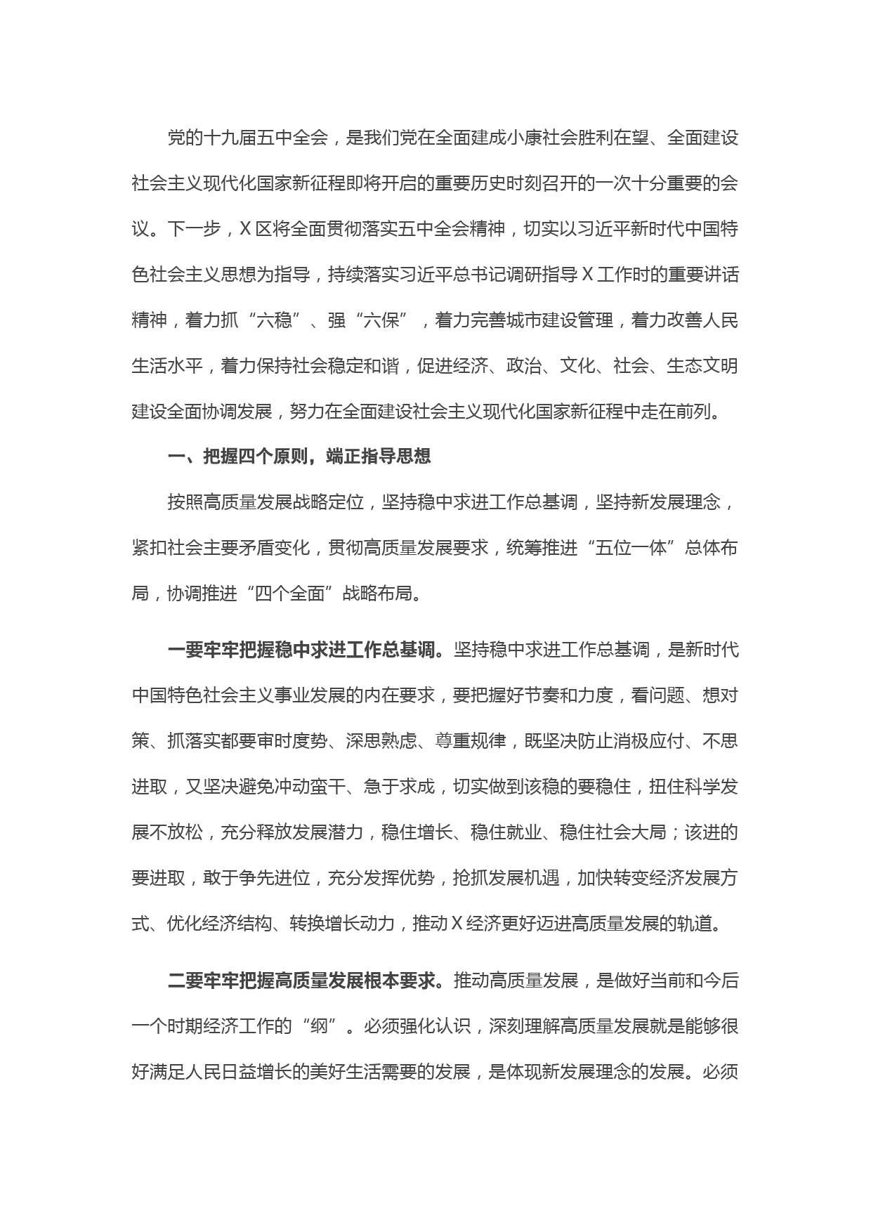 黨的十九屆五中全會(huì),是我們黨在全面建成小康社會(huì)勝利在望、全面建設(shè)社會(huì)主義現(xiàn)代化國家新征程即將開啟的重要?dú)v史時(shí)刻召開的一次十分重要的會(huì)議。下一步,X區(qū)將全面貫徹落實(shí)五中全會(huì)精神,切實(shí)以習(xí)近平新時(shí)代中國特色社會(huì)主義思想為指導(dǎo),持續(xù)落實(shí)習(xí)近平總書記調(diào)研指導(dǎo)X工作時(shí)的重要講話精神,著力抓“六穩(wěn)”、強(qiáng)“六?!保ν晟瞥鞘薪ㄔO(shè)管理,著力改善人民生活水平,著力保持社會(huì)穩(wěn)定和諧,促進(jìn)經(jīng)濟(jì)、政治、文化、社會(huì)、生態(tài)文明建設(shè)全面協(xié)調(diào)發(fā)展,努力在全面建設(shè)社會(huì)主義現(xiàn)代化國家新征程中走在前列。一、把握四個(gè)原則,端正指導(dǎo)思想按照高質(zhì)量發(fā)展戰(zhàn)略定位,堅(jiān)持穩(wěn)...