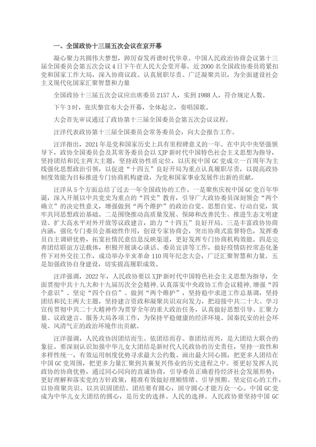 一、全國(guó)政協(xié)十三屆五次會(huì)議在京開幕凝心聚力共圓偉大夢(mèng)想,踔厲奮發(fā)再譜時(shí)代華章。中國(guó)人民政治協(xié)商會(huì)議第十三屆全國(guó)委員會(huì)第五次會(huì)議4日下午在人民大會(huì)堂開幕。近2000名全國(guó)政協(xié)委員將緊扣黨和國(guó)家工作大局,深入?yún)f(xié)商議政、認(rèn)真展職盡責(zé)、廣泛凝聚共識(shí),為全面建設(shè)社會(huì)主義現(xiàn)代化國(guó)家匯聚智慧和力量全國(guó)政協(xié)十三屆五次會(huì)議應(yīng)出席委員2157人,實(shí)到1988人,符合規(guī)定人數(shù)。下午3時(shí),張慶黎宣布大會(huì)開幕,全體起立,奏唱國(guó)歌。大會(huì)首先審議通過(guò)了政協(xié)第十三屆全國(guó)委員會(huì)第五次會(huì)議議程。汪洋代表政協(xié)第十三屆全國(guó)委員會(huì)常務(wù)委員會(huì),向大會(huì)報(bào)告工作。汪洋指出,2021年是黨和...