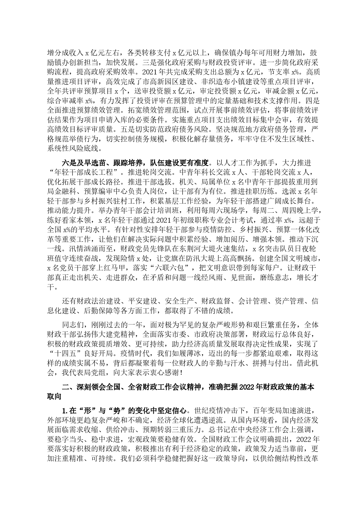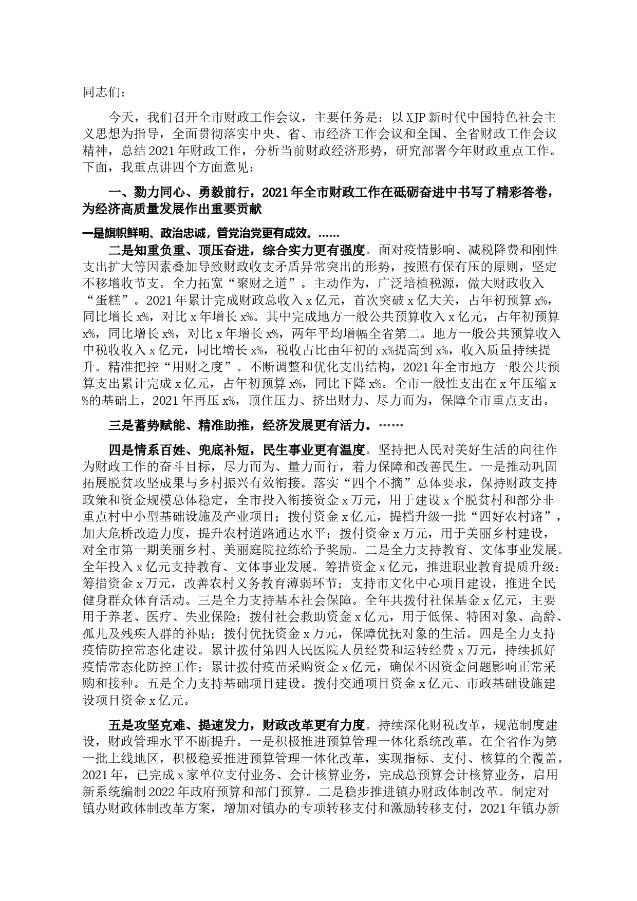同志們:今天,我們召開全市財政工作會議,主要任務(wù)是:以XJP新時代中國特色社會主義思想為指導(dǎo),全面貫徹落實中央、省、市經(jīng)濟工作會議和全國、全省財政工作會議精神,總結(jié)2021年財政工作,分析當(dāng)前財政經(jīng)濟形勢,研究部署今年財政重點工作。下面,我重點講四個方面意見:一、勠力同心、勇毅前行,2021年全市財政工作在砥礪奮進中書寫了精彩答卷,為經(jīng)濟高質(zhì)量發(fā)展作出重要貢獻一是旗幟鮮明、政治忠誠,管黨治黨更有成效?!侵刎撝亍㈨攭簥^進,綜合實力更有強度。面對疫情影響、減稅降費和剛性支出擴大等因素疊加導(dǎo)致財政收支矛盾異常突出的形勢,按照有保有壓...