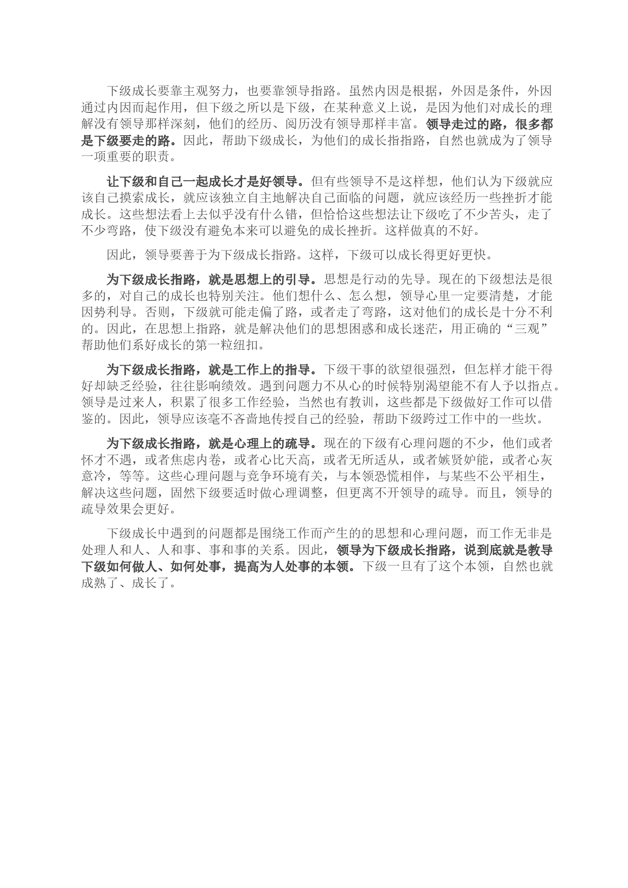 下級(jí)成長(zhǎng)要靠主觀努力,也要靠領(lǐng)導(dǎo)指路。雖然內(nèi)因是根據(jù),外因是條件,外因通過(guò)內(nèi)因而起作用,但下級(jí)之所以是下級(jí),在某種意義上說(shuō),是因?yàn)樗麄儗?duì)成長(zhǎng)的理解沒(méi)有領(lǐng)導(dǎo)那樣深刻,他們的經(jīng)歷、閱歷沒(méi)有領(lǐng)導(dǎo)那樣豐富。領(lǐng)導(dǎo)走過(guò)的路,很多都是下級(jí)要走的路。因此,幫助下級(jí)成長(zhǎng),為他們的成長(zhǎng)指指路,自然也就成為了領(lǐng)導(dǎo)一項(xiàng)重要的職責(zé)。讓下級(jí)和自己一起成長(zhǎng)才是好領(lǐng)導(dǎo)。但有些領(lǐng)導(dǎo)不是這樣想,他們認(rèn)為下級(jí)就應(yīng)該自己摸索成長(zhǎng),就應(yīng)該獨(dú)立自主地解決自己面臨的問(wèn)題,就應(yīng)該經(jīng)歷一些挫折才能成長(zhǎng)。這些想法看上去似乎沒(méi)有什么錯(cuò),但恰恰這些想法讓下級(jí)吃了不少苦頭,走了不少...