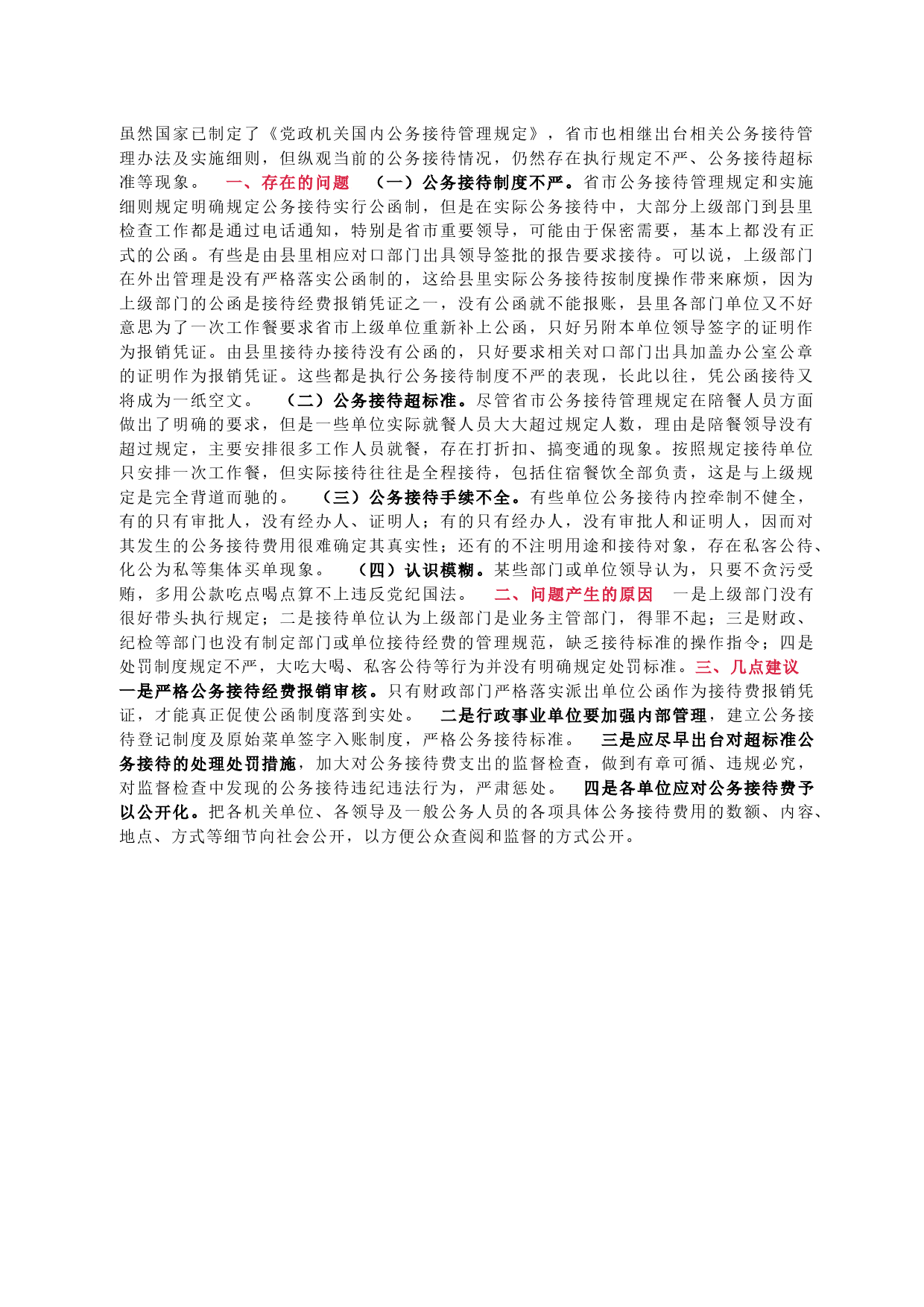 雖然國家已制定了《黨政機關國內公務接待管理規(guī)定》,省市也相繼出臺相關公務接待管理辦法及實施細則,但縱觀當前的公務接待情況,仍然存在執(zhí)行規(guī)定不嚴、公務接待超標準等現(xiàn)象。一、存在的問題(一)公務接待制度不嚴。省市公務接待管理規(guī)定和實施細則規(guī)定明確規(guī)定公務接待實行公函制,但是在實際公務接待中,大部分上級部門到縣里檢查工作都是通過電話通知,特別是省市重要領導,可能由于保密需要,基本上都沒有正式的公函。有些是由縣里相應對口部門出具領導簽批的報告要求接待??梢哉f,上級部門在外出管理是沒有嚴格落實公函制的,這給縣里實際公務接待按制度操作帶...