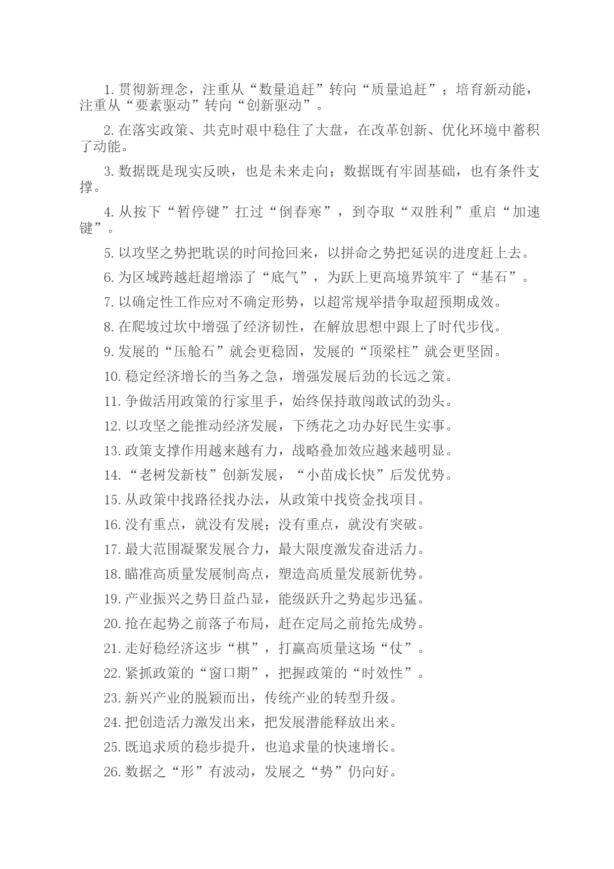 1.貫徹新理念,注重從“數(shù)量追趕”轉(zhuǎn)向“質(zhì)量追趕”;培育新動能,注重從“要素驅(qū)動”轉(zhuǎn)向“創(chuàng)新驅(qū)動”。2.在落實(shí)政策、共克時(shí)艱中穩(wěn)住了大盤,在改革創(chuàng)新、優(yōu)化環(huán)境中蓄積了動能。3.數(shù)據(jù)既是現(xiàn)實(shí)反映,也是未來走向;數(shù)據(jù)既有牢固基礎(chǔ),也有條件支撐。4.從按下“暫停鍵”扛過“倒春寒”,到奪取“雙勝利”重啟“加速鍵”。5.以攻堅(jiān)之勢把耽誤的時(shí)間搶回來,以拼命之勢把延誤的進(jìn)度趕上去。6.為區(qū)域跨越趕超增添了“底氣”,為躍上更高境界筑牢了“基石”。7.以確定性工作應(yīng)對不確定形勢,以超常規(guī)舉措爭取超預(yù)期成效。8.在爬坡過坎中增強(qiáng)了經(jīng)濟(jì)韌性,在解放思想中跟上了...