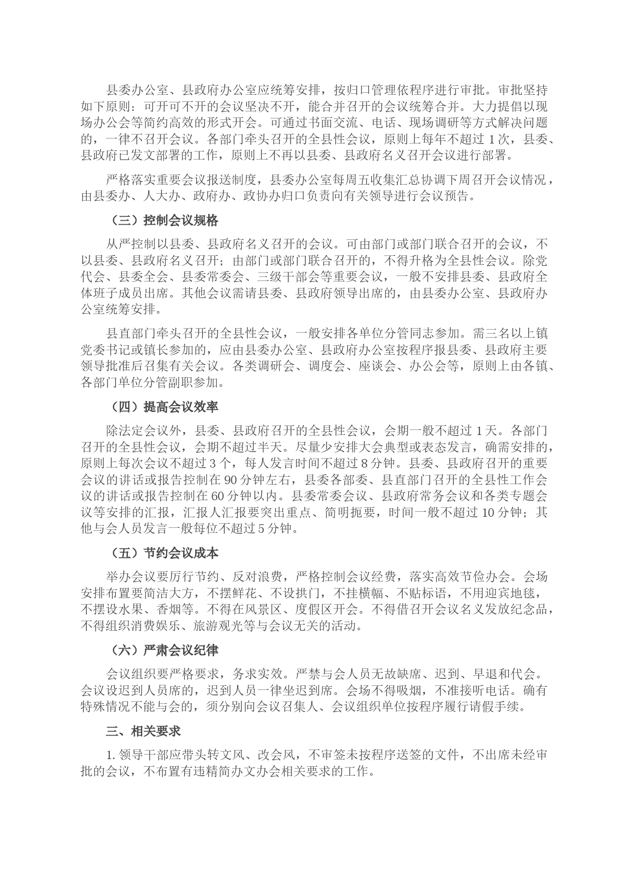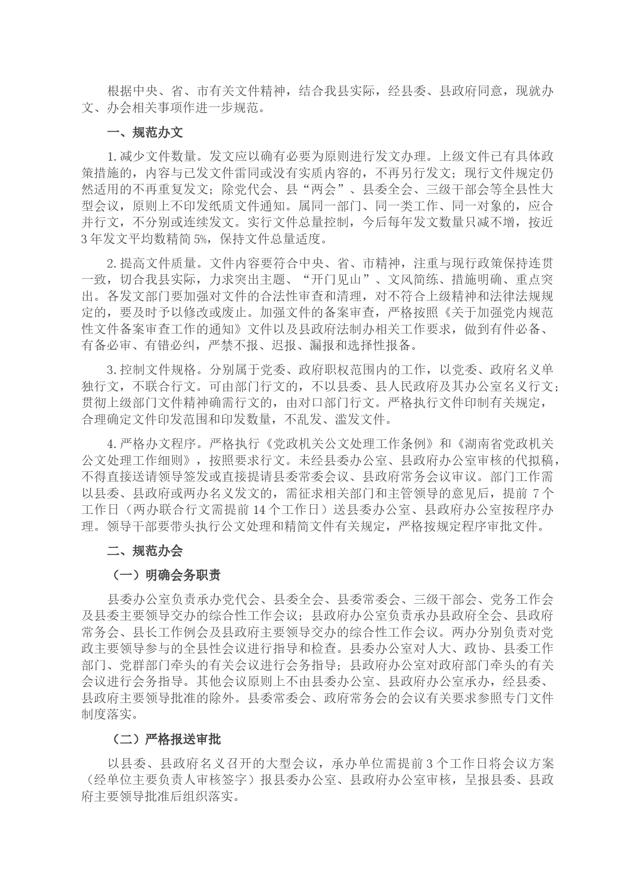 根據(jù)中央、省、市有關(guān)文件精神,結(jié)合我縣實際,經(jīng)縣委、縣政府同意,現(xiàn)就辦文、辦會相關(guān)事項作進(jìn)一步規(guī)范。一、規(guī)范辦文1.減少文件數(shù)量。發(fā)文應(yīng)以確有必要為原則進(jìn)行發(fā)文辦理。上級文件已有具體政策措施的,內(nèi)容與已發(fā)文件雷同或沒有實質(zhì)內(nèi)容的,不再另行發(fā)文;現(xiàn)行文件規(guī)定仍然適用的不再重復(fù)發(fā)文;除黨代會、縣“兩會”、縣委全會、三級干部會等全縣性大型會議,原則上不印發(fā)紙質(zhì)文件通知。屬同一部門、同一類工作、同一對象的,應(yīng)合并行文,不分別或連續(xù)發(fā)文。實行文件總量控制,今后每年發(fā)文數(shù)量只減不增,按近3年發(fā)文平均數(shù)精簡5%,保持文件總量適度。2.提高文件質(zhì)...