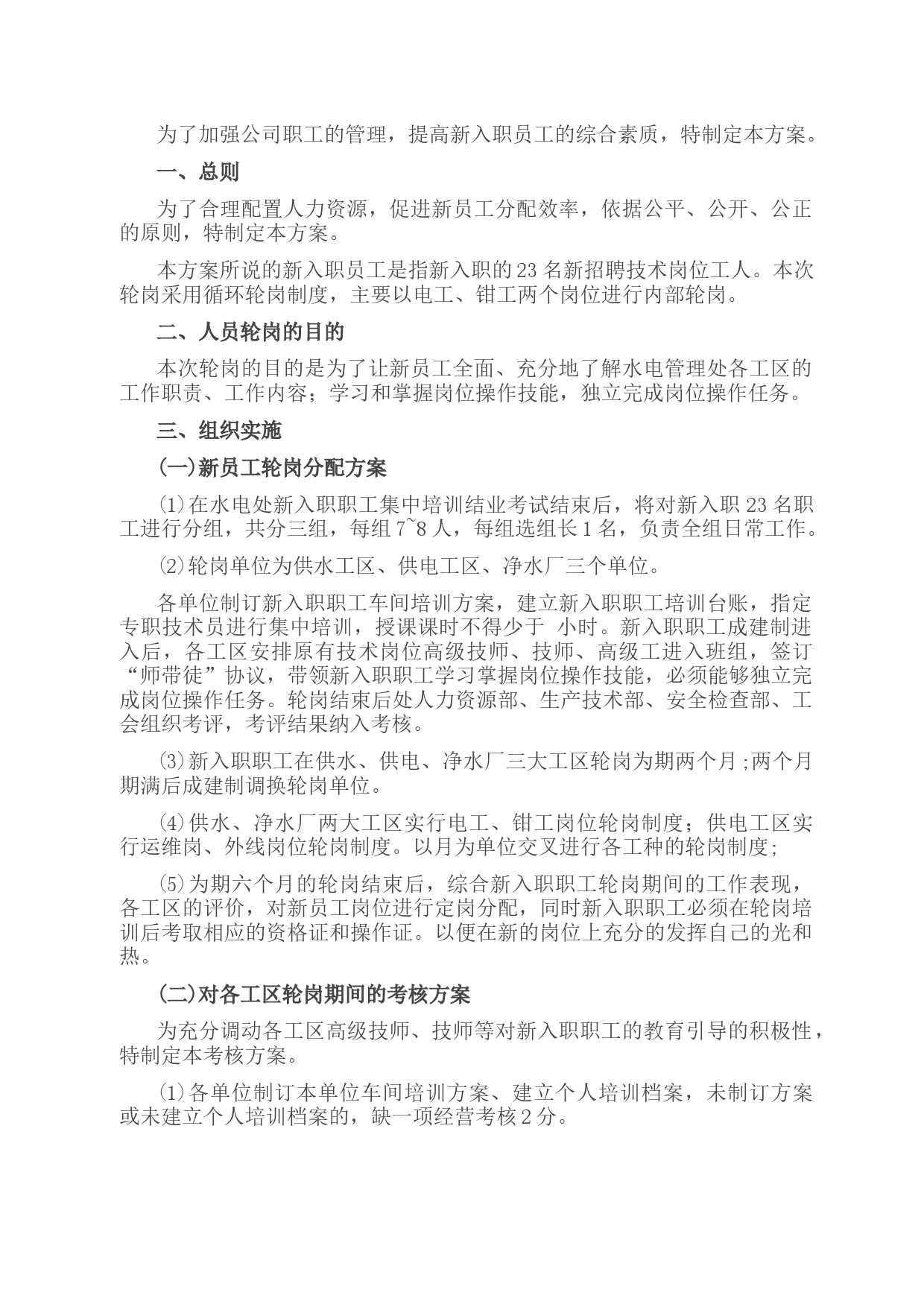 為了加強(qiáng)公司職工的管理,提高新入職員工的綜合素質(zhì),特制定本方案。一、總則為了合理配置人力資源,促進(jìn)新員工分配效率,依據(jù)公平、公開、公正的原則,特制定本方案。本方案所說的新入職員工是指新入職的23名新招聘技術(shù)崗位工人。本次輪崗采用循環(huán)輪崗制度,主要以電工、鉗工兩個(gè)崗位進(jìn)行內(nèi)部輪崗。二、人員輪崗的目的本次輪崗的目的是為了讓新員工全面、充分地了解水電管理處各工區(qū)的工作職責(zé)、工作內(nèi)容;學(xué)習(xí)和掌握崗位操作技能,獨(dú)立完成崗位操作任務(wù)。三、組織實(shí)施(一)新員工輪崗分配方案(1)在水電處新入職職工集中培訓(xùn)結(jié)業(yè)考試結(jié)束后,將對新入職23名職工進(jìn)行分組...