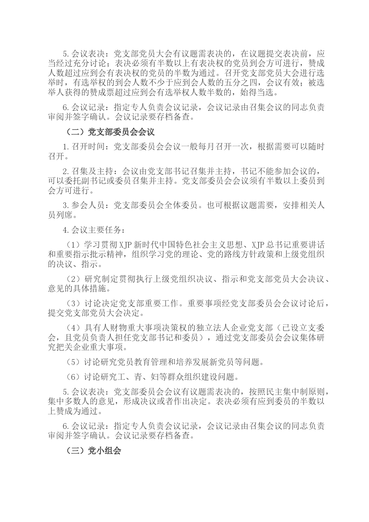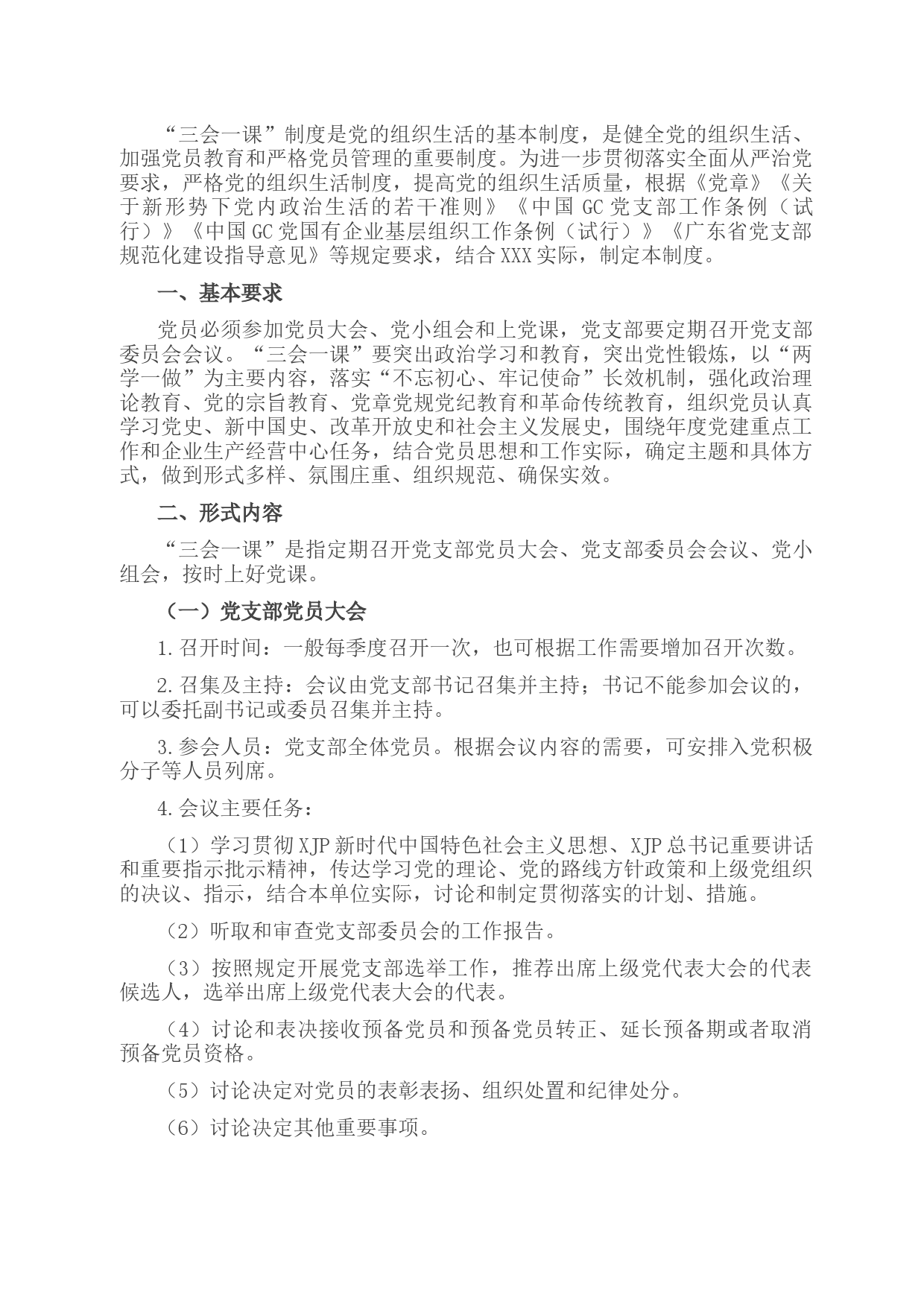 “三會(huì)一課”制度是黨的組織生活的基本制度,是健全黨的組織生活、加強(qiáng)黨員教育和嚴(yán)格黨員管理的重要制度。為進(jìn)一步貫徹落實(shí)全面從嚴(yán)治黨要求,嚴(yán)格黨的組織生活制度,提高黨的組織生活質(zhì)量,根據(jù)《黨章》《關(guān)于新形勢(shì)下黨內(nèi)政治生活的若干準(zhǔn)則》《中國(guó)GC黨支部工作條例(試行)》《中國(guó)GC黨國(guó)有企業(yè)基層組織工作條例(試行)》《廣東省黨支部規(guī)范化建設(shè)指導(dǎo)意見(jiàn)》等規(guī)定要求,結(jié)合XXX實(shí)際,制定本制度。一、基本要求黨員必須參加黨員大會(huì)、黨小組會(huì)和上黨課,黨支部要定期召開(kāi)黨支部委員會(huì)會(huì)議?!叭龝?huì)一課”要突出政治學(xué)習(xí)和教育,突出黨性鍛煉,以“兩學(xué)一做”為主要...