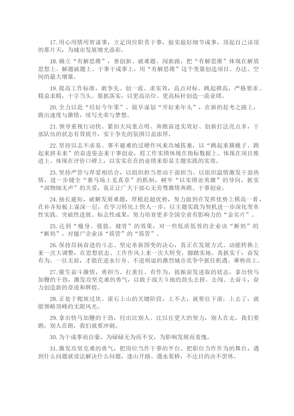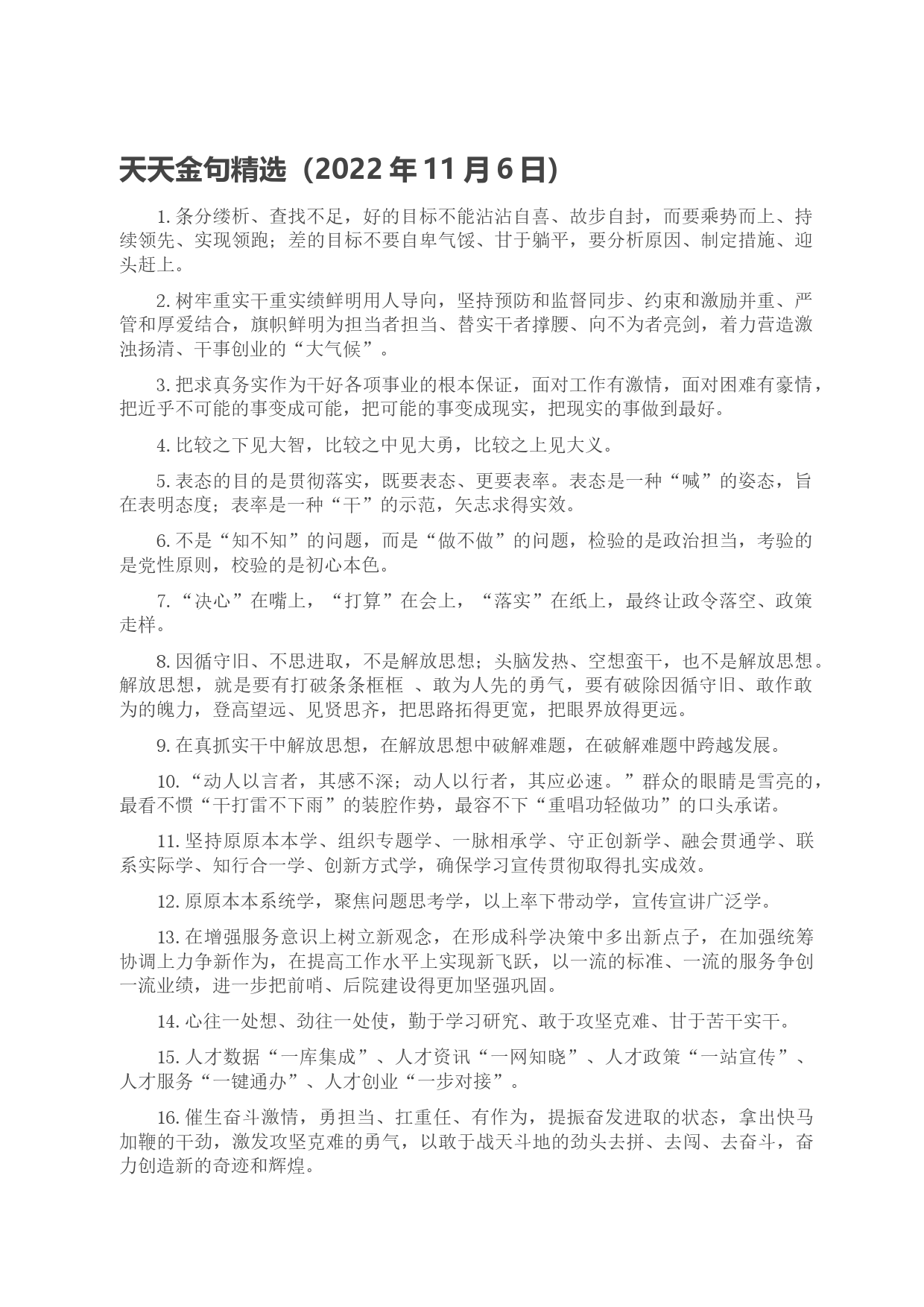 天天金句精選(2022年11月6日)1.條分縷析、查找不足,好的目標(biāo)不能沾沾自喜、故步自封,而要乘勢而上、持續(xù)領(lǐng)先、實(shí)現(xiàn)領(lǐng)跑;差的目標(biāo)不要自卑氣餒、甘于躺平,要分析原因、制定措施、迎頭趕上。2.樹牢重實(shí)干重實(shí)績鮮明用人導(dǎo)向,堅(jiān)持預(yù)防和監(jiān)督同步、約束和激勵并重、嚴(yán)管和厚愛結(jié)合,旗幟鮮明為擔(dān)當(dāng)者擔(dān)當(dāng)、替實(shí)干者撐腰、向不為者亮劍,著力營造激濁揚(yáng)清、干事創(chuàng)業(yè)的“大氣候”。3.把求真務(wù)實(shí)作為干好各項(xiàng)事業(yè)的根本保證,面對工作有激情,面對困難有豪情,把近乎不可能的事變成可能,把可能的事變成現(xiàn)實(shí),把現(xiàn)實(shí)的事做到最好。4.比較之下見大智,比較之中見大勇,比...