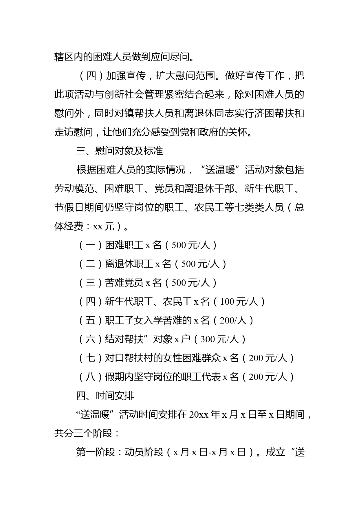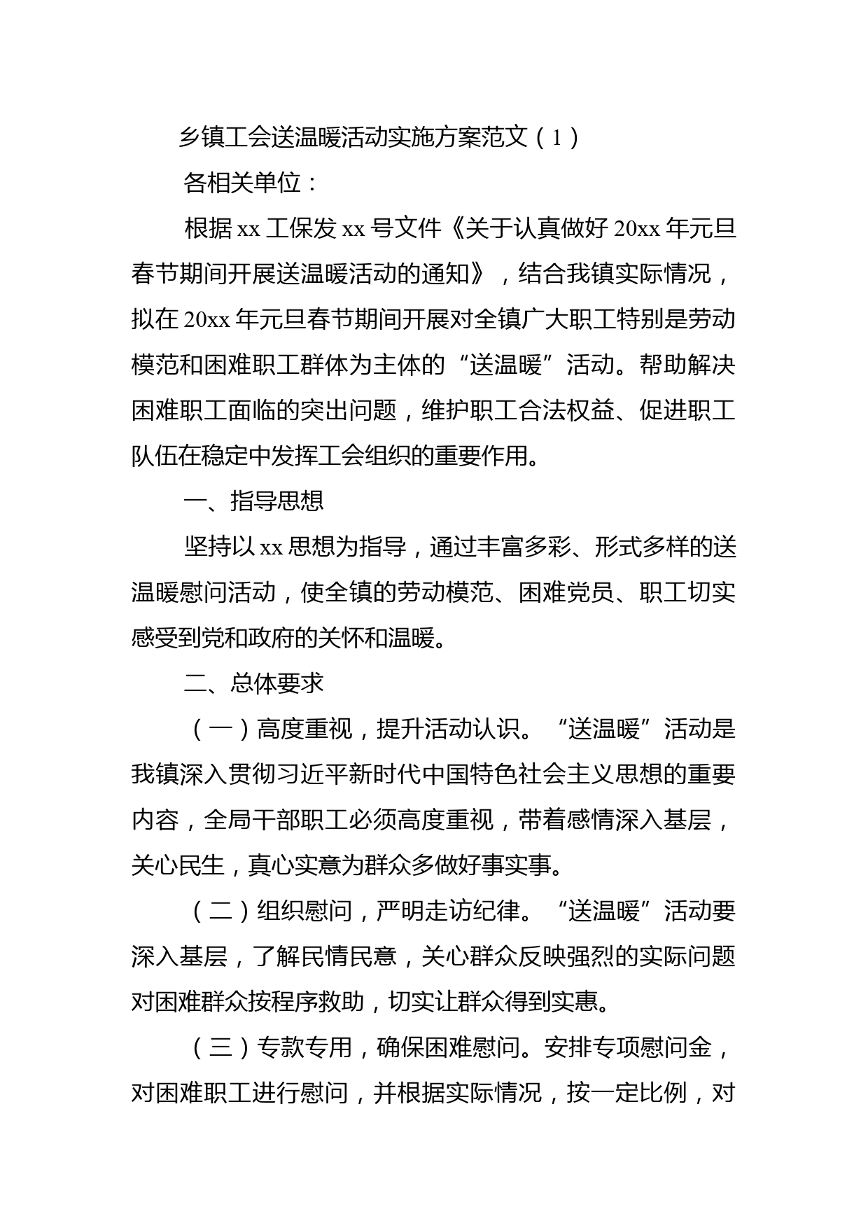 鄉(xiāng)鎮(zhèn)工會送溫暖活動實施方案范文(1)各相關(guān)單位:根據(jù)xx工保發(fā)xx號文件《關(guān)于認真做好20xx年元旦春節(jié)期間開展送溫暖活動的通知》,結(jié)合我鎮(zhèn)實際情況,擬在20xx年元旦春節(jié)期間開展對全鎮(zhèn)廣大職工特別是勞動模范和困難職工群體為主體的“送溫暖”活動。幫助解決困難職工面臨的突出問題,維護職工合法權(quán)益、促進職工隊伍在穩(wěn)定中發(fā)揮工會組織的重要作用。一、指導(dǎo)思想堅持以xx思想為指導(dǎo),通過豐富多彩、形式多樣的送溫暖慰問活動,使全鎮(zhèn)的勞動模范、困難黨員、職工切實感受到黨和政府的關(guān)懷和溫暖。二、總體要求(一)高度重視,提升活動認識?!八蜏嘏被顒邮俏益?zhèn)深入...