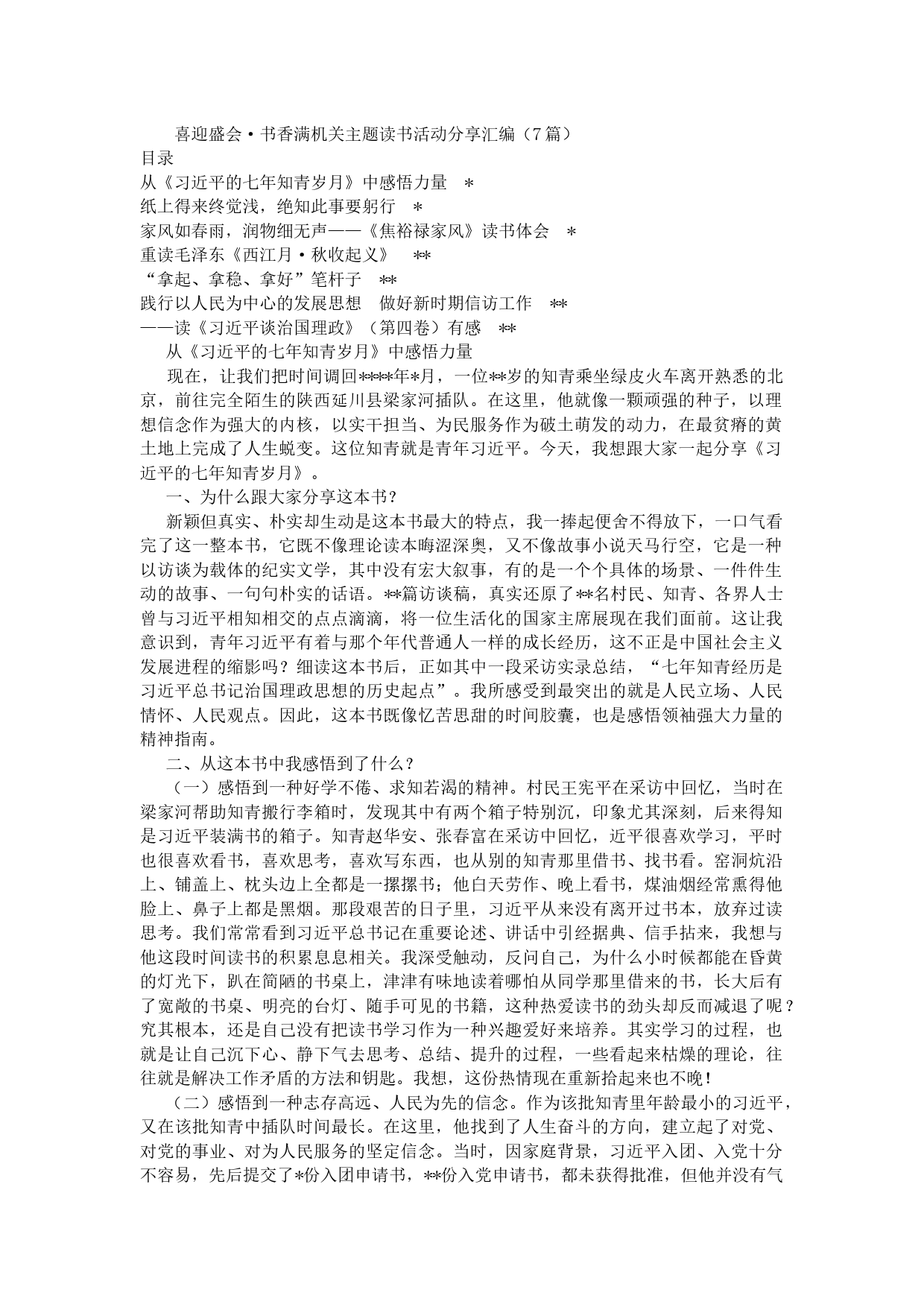 喜迎盛會(huì)·書香滿機(jī)關(guān)主題讀書活動(dòng)分享匯編(7篇)目錄從《習(xí)近平的七年知青歲月》中感悟力量紙上得來終覺淺,絕知此事要躬行家風(fēng)如春雨,潤(rùn)物細(xì)無聲——《焦裕祿家風(fēng)》讀書體會(huì)重讀毛澤東《西江月·秋收起義》“拿起、拿穩(wěn)、拿好”筆桿子踐行以人民為中心的發(fā)展思想做好新時(shí)期信訪工作——讀《習(xí)近平談治國(guó)理政》(第四卷)有感從《習(xí)近平的七年知青歲月》中感悟力量現(xiàn)在,讓我們把時(shí)間調(diào)回年月,一位歲的知青乘坐綠皮火車離開熟悉的北京,前往完全陌生的陜西延川縣梁家河插隊(duì)。在這里,他就像一顆頑強(qiáng)的種子,以理想信念作為強(qiáng)大的內(nèi)核,以實(shí)干擔(dān)當(dāng)、為民服務(wù)作為破土...