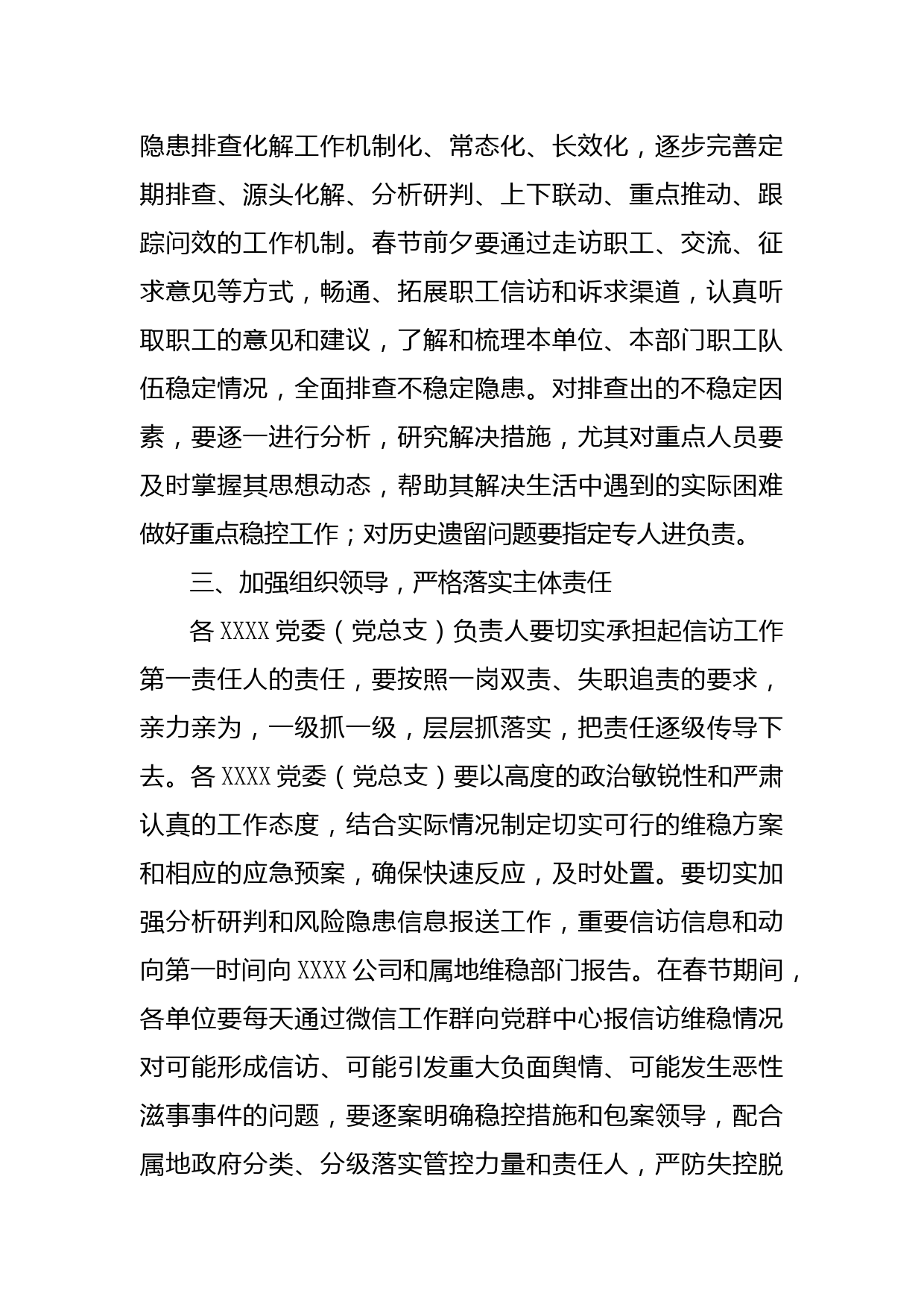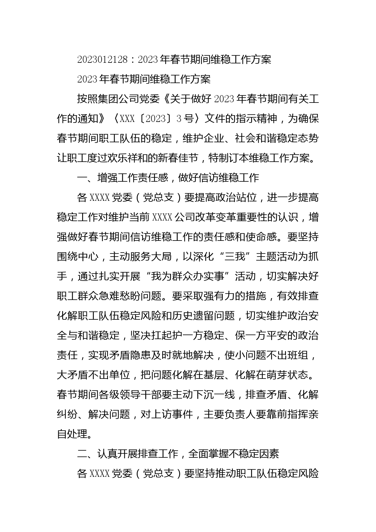 2023012128:2023年春節(jié)期間維穩(wěn)工作方案2023年春節(jié)期間維穩(wěn)工作方案按照集團(tuán)公司黨委《關(guān)于做好2023年春節(jié)期間有關(guān)工作的通知》〈XXX〔2023〕3號〉文件的指示精神,為確保春節(jié)期間職工隊伍的穩(wěn)定,維護(hù)企業(yè)、社會和諧穩(wěn)定態(tài)勢讓職工度過歡樂祥和的新春佳節(jié),特制訂本維穩(wěn)工作方案。一、增強(qiáng)工作責(zé)任感,做好信訪維穩(wěn)工作各XXXX黨委(黨總支)要提高政治站位,進(jìn)一步提高穩(wěn)定工作對維護(hù)當(dāng)前XXXX公司改革變革重要性的認(rèn)識,增強(qiáng)做好春節(jié)期間信訪維穩(wěn)工作的責(zé)任感和使命感。要堅持圍繞中心,主動服務(wù)大局,以深化“三我”主題活動為抓手,通過扎實開展“我為群眾辦實事”活...