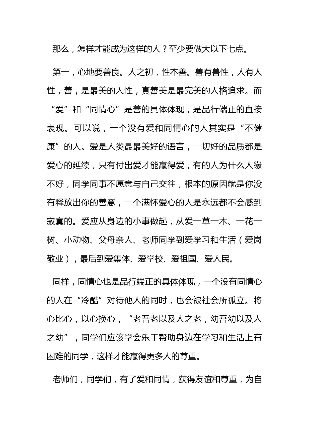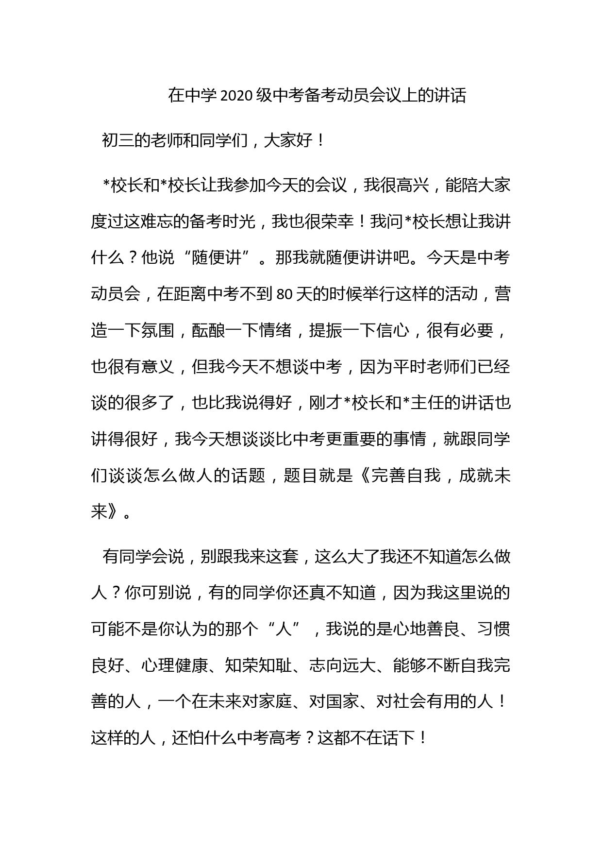 在中學(xué)2020級(jí)中考備考動(dòng)員會(huì)議上的講話初三的老師和同學(xué)們,大家好!校長(zhǎng)和校長(zhǎng)讓我參加今天的會(huì)議,我很高興,能陪大家度過(guò)這難忘的備考時(shí)光,我也很榮幸!我問(wèn)校長(zhǎng)想讓我講什么?他說(shuō)“隨便講”。那我就隨便講講吧。今天是中考動(dòng)員會(huì),在距離中考不到80天的時(shí)候舉行這樣的活動(dòng),營(yíng)造一下氛圍,醞釀一下情緒,提振一下信心,很有必要,也很有意義,但我今天不想談中考,因?yàn)槠綍r(shí)老師們已經(jīng)談的很多了,也比我說(shuō)得好,剛才校長(zhǎng)和主任的講話也講得很好,我今天想談?wù)劚戎锌几匾氖虑椋透瑢W(xué)們談?wù)勗趺醋鋈说脑掝},題目就是《完善自我,成就未來(lái)》。有同學(xué)會(huì)說(shuō),別跟...