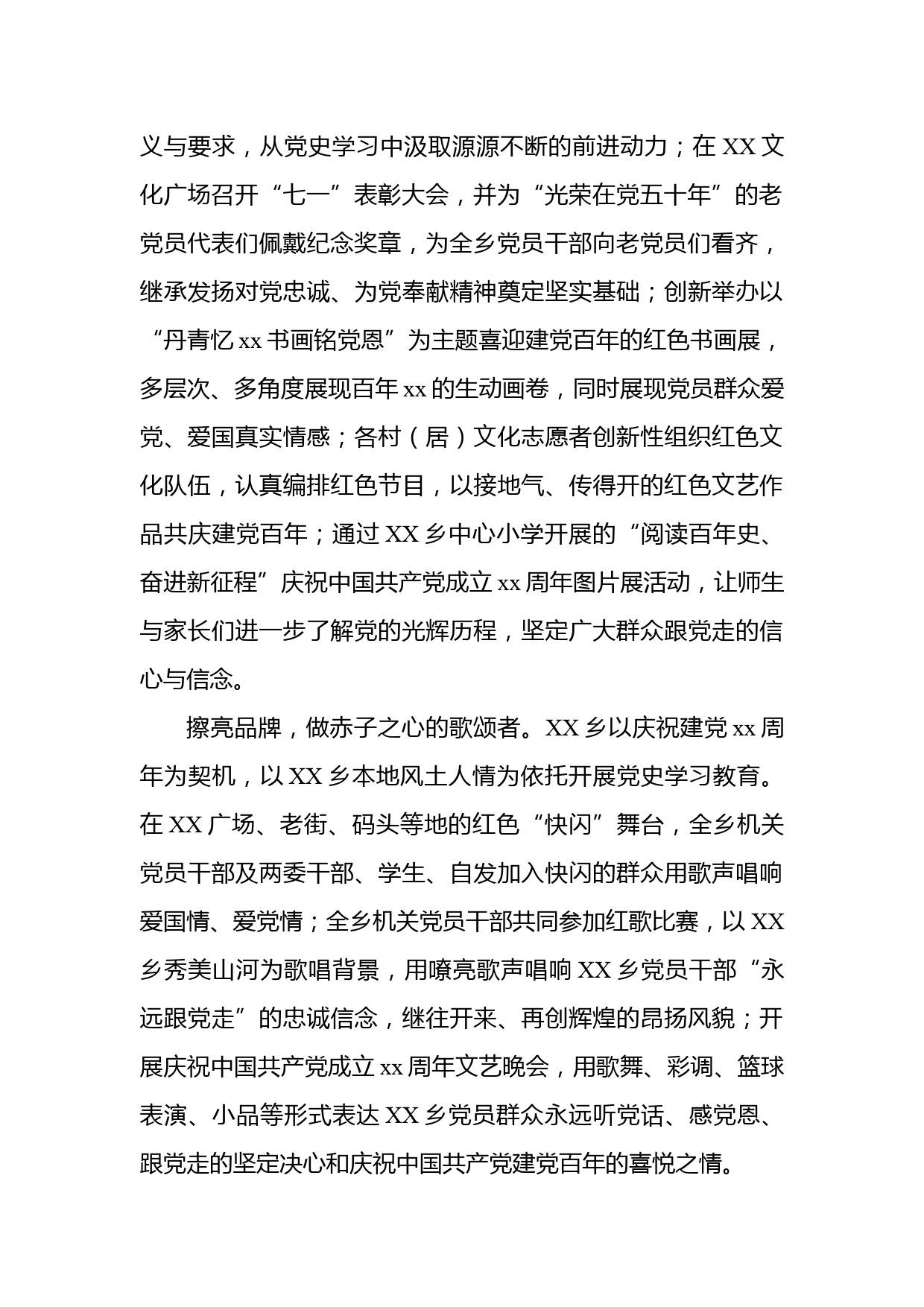 四舉措做黨史學(xué)習(xí)教育追“史”者“百年征程波瀾壯闊,百年初心歷久彌堅(jiān)”,為更好延續(xù)革命傳統(tǒng),XX市XX縣XX鄉(xiāng)始終把黨史學(xué)習(xí)教育作為工作指引的有力方向,以組織領(lǐng)導(dǎo)有力、示范帶動(dòng)有力、督促指導(dǎo)有力的舉措,高標(biāo)準(zhǔn)高質(zhì)量謀劃推進(jìn)各項(xiàng)工作,引導(dǎo)廣大黨員干部、群眾主動(dòng)學(xué)黨史、強(qiáng)自信,做精神文明的傳播者。全面覆蓋,做黨史知識(shí)的學(xué)習(xí)者。通過個(gè)人自學(xué)、集中學(xué)習(xí)、專題研討、送學(xué)上門等方式,深化黨史學(xué)習(xí)教育主題。在鄉(xiāng)、村兩級(jí)共召開XX次專題黨課進(jìn)行黨史學(xué)習(xí),讓黨員干部帶頭學(xué)、農(nóng)村黨員積極學(xué),深入了解百年黨史,增強(qiáng)民族自信;開啟“黨員心聲大家談”“黨史故事...