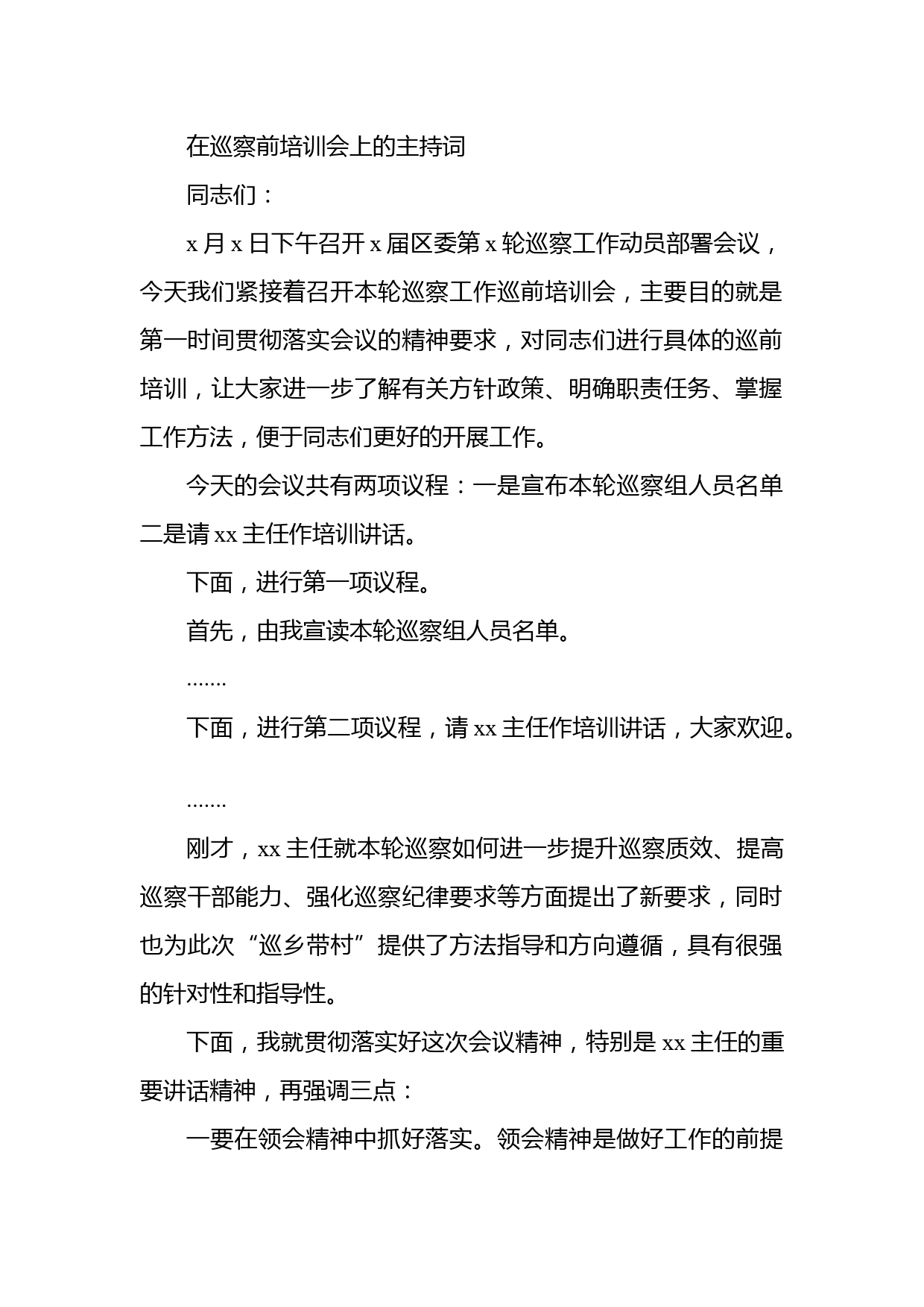 在巡察前培訓(xùn)會(huì)上的主持詞同志們:x月x日下午召開x屆區(qū)委第x輪巡察工作動(dòng)員部署會(huì)議,今天我們緊接著召開本輪巡察工作巡前培訓(xùn)會(huì),主要目的就是第一時(shí)間貫徹落實(shí)會(huì)議的精神要求,對同志們進(jìn)行具體的巡前培訓(xùn),讓大家進(jìn)一步了解有關(guān)方針政策、明確職責(zé)任務(wù)、掌握工作方法,便于同志們更好的開展工作。今天的會(huì)議共有兩項(xiàng)議程:一是宣布本輪巡察組人員名單二是請xx主任作培訓(xùn)講話。下面,進(jìn)行第一項(xiàng)議程。首先,由我宣讀本輪巡察組人員名單。.......下面,進(jìn)行第二項(xiàng)議程,請xx主任作培訓(xùn)講話,大家歡迎。.......剛才,xx主任就本輪巡察如何進(jìn)一步提升巡察質(zhì)效、提高巡察干...