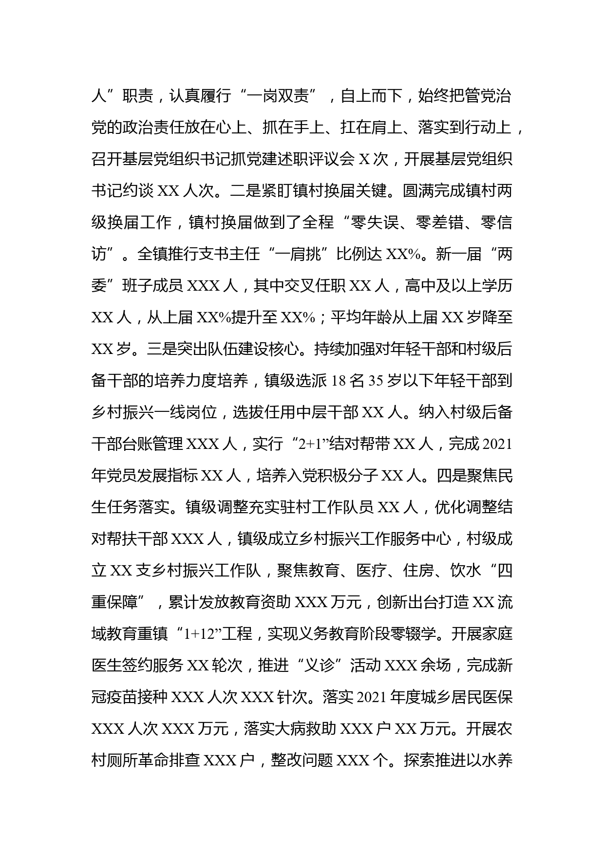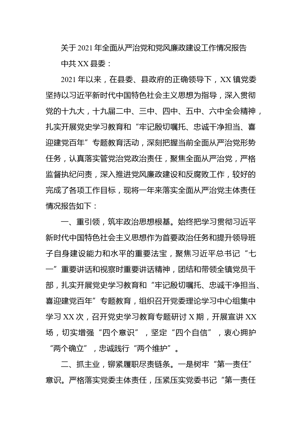 關(guān)于2021年全面從嚴(yán)治黨和黨風(fēng)廉政建設(shè)工作情況報(bào)告中共XX縣委:2021年以來(lái),在縣委、縣政府的正確領(lǐng)導(dǎo)下,XX鎮(zhèn)黨委堅(jiān)持以習(xí)近平新時(shí)代中國(guó)特色社會(huì)主義思想為指導(dǎo),深入貫徹黨的十九大,十九屆二中、三中、四中、五中、六中全會(huì)精神,扎實(shí)開展黨史學(xué)習(xí)教育和“牢記殷切囑托、忠誠(chéng)干凈擔(dān)當(dāng)、喜迎建黨百年”專題教育活動(dòng),深刻把握當(dāng)前全面從嚴(yán)治黨形勢(shì)任務(wù),認(rèn)真落實(shí)管黨治黨政治責(zé)任,聚焦全面從嚴(yán)治黨,嚴(yán)格監(jiān)督執(zhí)紀(jì)問責(zé),深入推進(jìn)黨風(fēng)廉政建設(shè)和反腐敗工作,較好的完成了各項(xiàng)工作目標(biāo),現(xiàn)將一年來(lái)落實(shí)全面從嚴(yán)治黨主體責(zé)任情況報(bào)告如下:一、重引領(lǐng),筑牢政治思想根基...