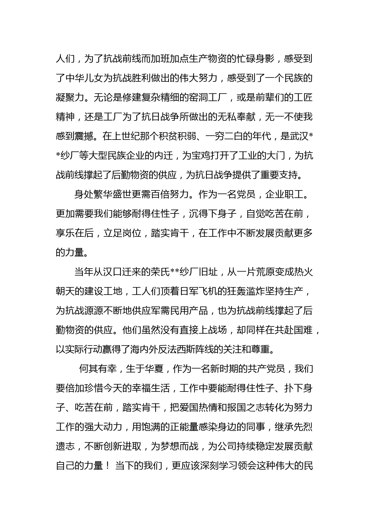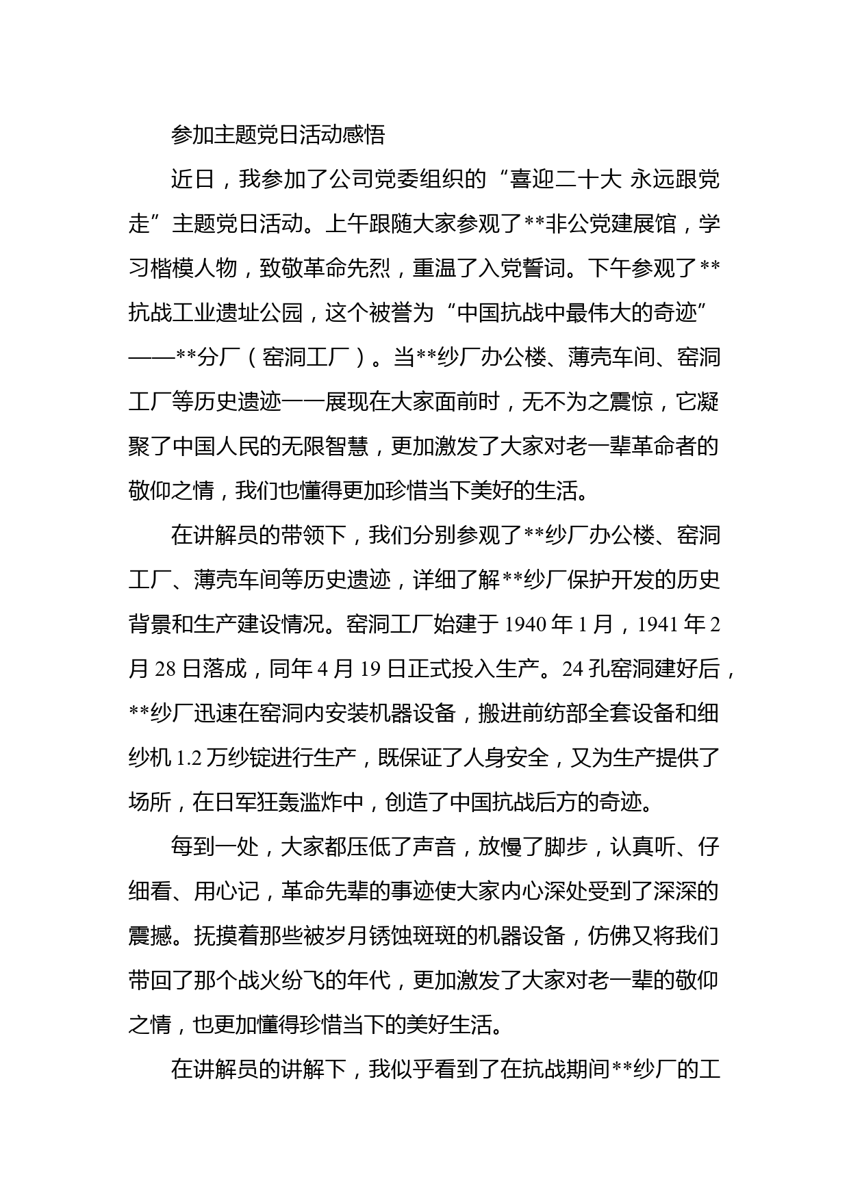 參加主題黨日活動感悟近日,我參加了公司黨委組織的“喜迎二十大永遠跟黨走”主題黨日活動。上午跟隨大家參觀了非公黨建展館,學(xué)習(xí)楷模人物,致敬革命先烈,重溫了入黨誓詞。下午參觀了抗戰(zhàn)工業(yè)遺址公園,這個被譽為“中國抗戰(zhàn)中最偉大的奇跡”——分廠(窯洞工廠)。當(dāng)紗廠辦公樓、薄殼車間、窯洞工廠等歷史遺跡一一展現(xiàn)在大家面前時,無不為之震驚,它凝聚了中國人民的無限智慧,更加激發(fā)了大家對老一輩革命者的敬仰之情,我們也懂得更加珍惜當(dāng)下美好的生活。在講解員的帶領(lǐng)下,我們分別參觀了紗廠辦公樓、窯洞工廠、薄殼車間等歷史遺跡,詳細(xì)了解紗廠保護開發(fā)的歷史背...