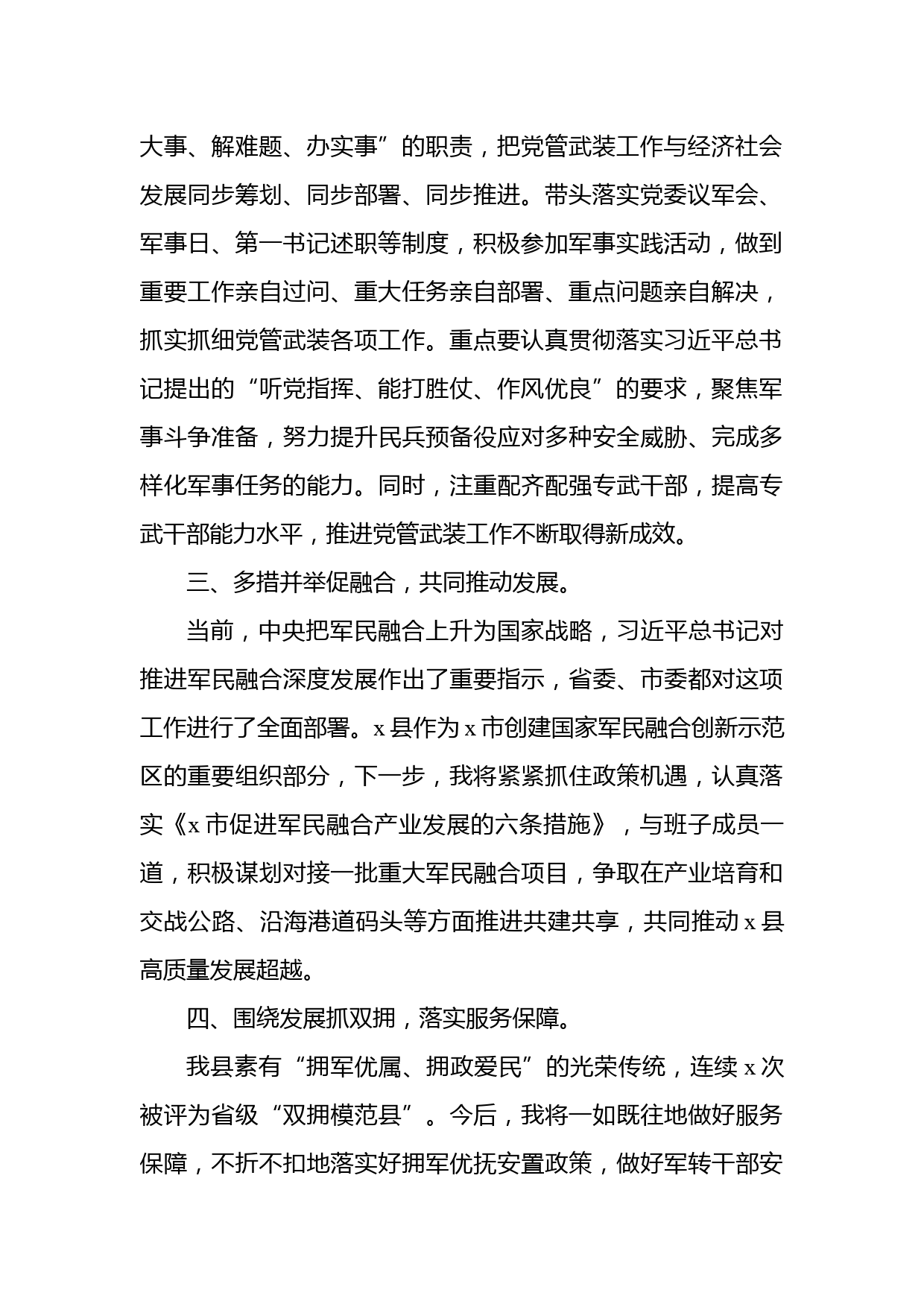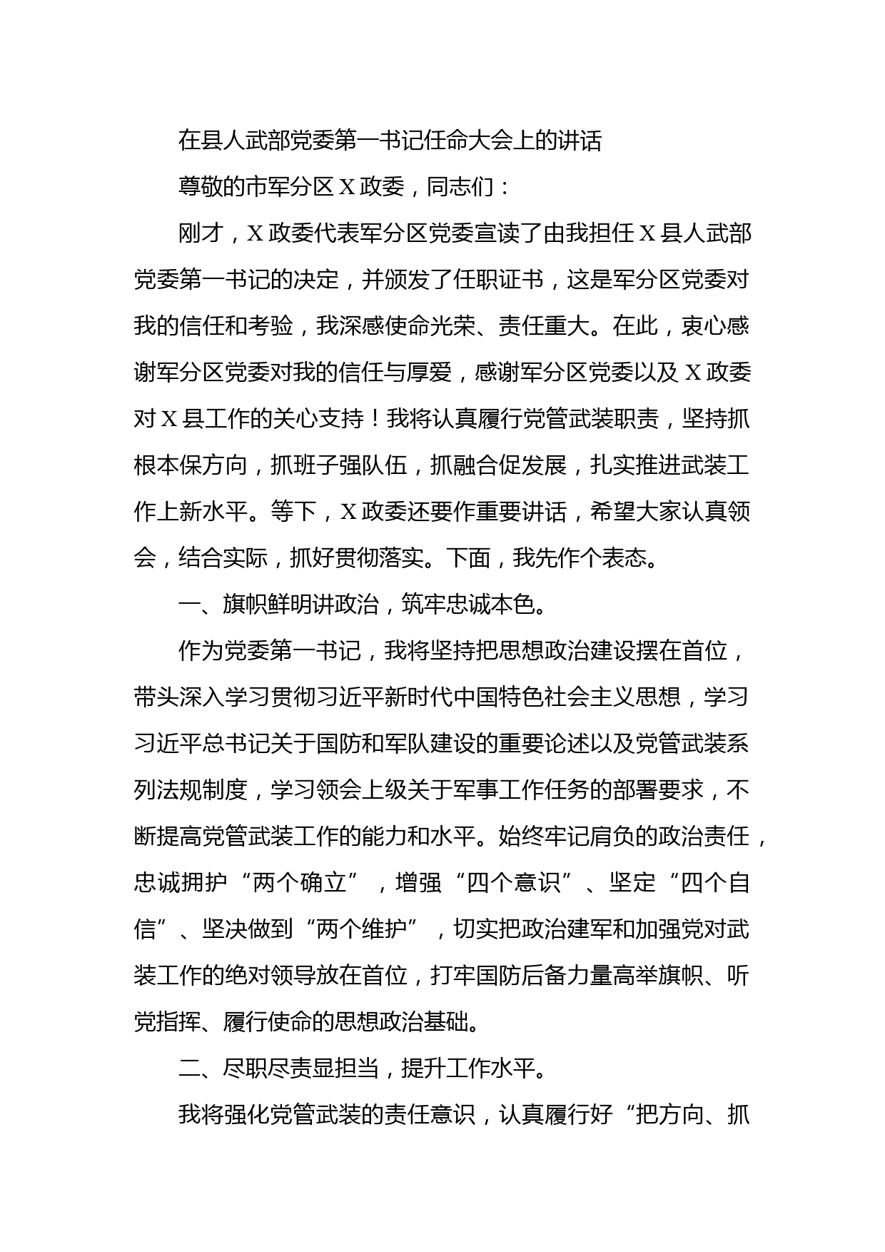 在縣人武部黨委第一書記任命大會上的講話尊敬的市軍分區(qū)X政委,同志們:剛才,X政委代表軍分區(qū)黨委宣讀了由我擔(dān)任X縣人武部黨委第一書記的決定,并頒發(fā)了任職證書,這是軍分區(qū)黨委對我的信任和考驗,我深感使命光榮、責(zé)任重大。在此,衷心感謝軍分區(qū)黨委對我的信任與厚愛,感謝軍分區(qū)黨委以及X政委對X縣工作的關(guān)心支持!我將認(rèn)真履行黨管武裝職責(zé),堅持抓根本保方向,抓班子強隊伍,抓融合促發(fā)展,扎實推進武裝工作上新水平。等下,X政委還要作重要講話,希望大家認(rèn)真領(lǐng)會,結(jié)合實際,抓好貫徹落實。下面,我先作個表態(tài)。一、旗幟鮮明講政治,筑牢忠誠本色。作為黨委第一...