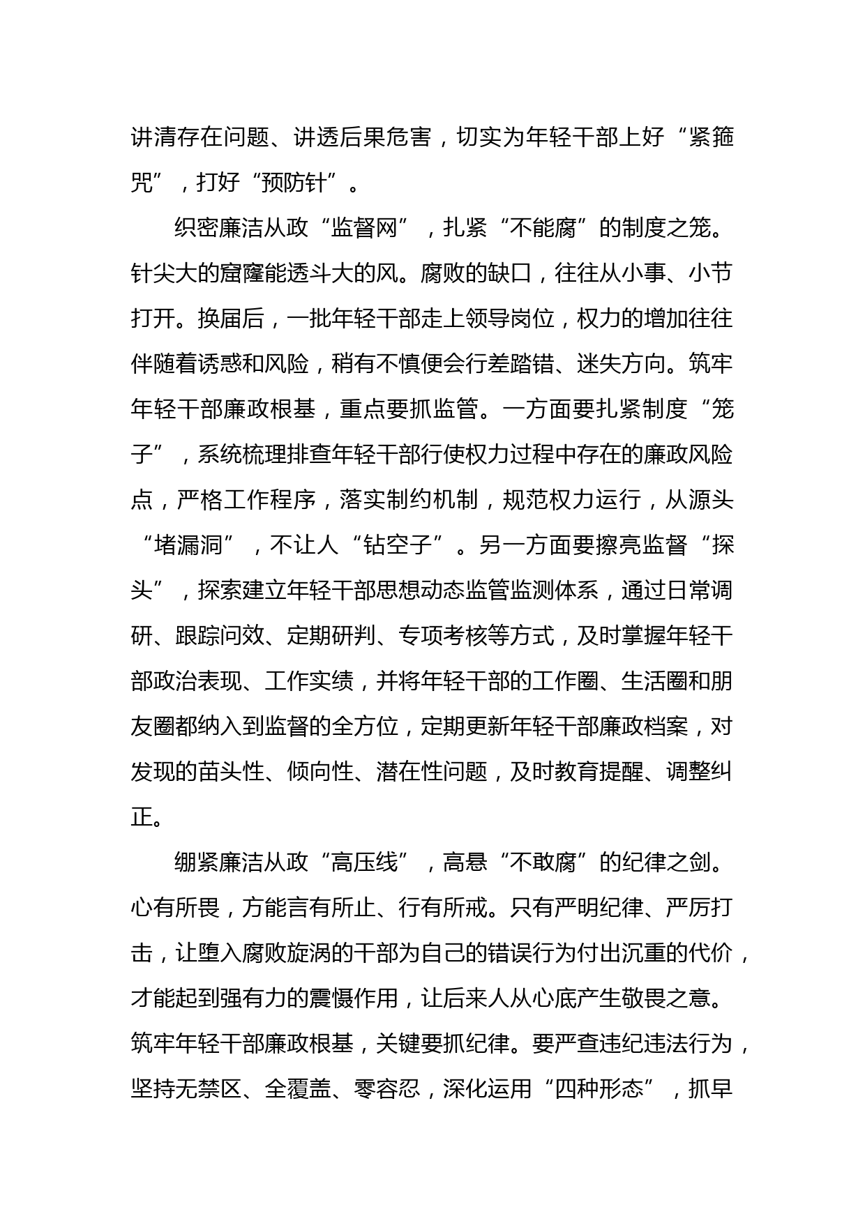 組織部長言論:筑牢年輕干部廉政根基習(xí)近平總書記在2022年春季學(xué)期中央黨校(國家行政學(xué)院)中青年干部培訓(xùn)班開班式上發(fā)表重要講話強調(diào),“年輕干部必須牢記清廉是福、貪欲是禍的道理”,“守牢拒腐防變防線”,“勤撣‘思想塵’、多思‘貪欲害’、常破‘心中賊’,以內(nèi)無妄思保證外無妄動”。年輕干部能否廉潔自律,不僅僅關(guān)乎其個人的前途命運,也關(guān)乎黨和國家事業(yè)發(fā)展,必須從嚴(yán)從實抓好管好,確保干部隊伍的源頭活水始終是一泓清泉。上好廉潔從政“第一課”,筑牢“不想腐”的思想之堤。思想上松一寸,行動上就會差一尺。只有思想上正本清源、固本培元,方能行動上自...