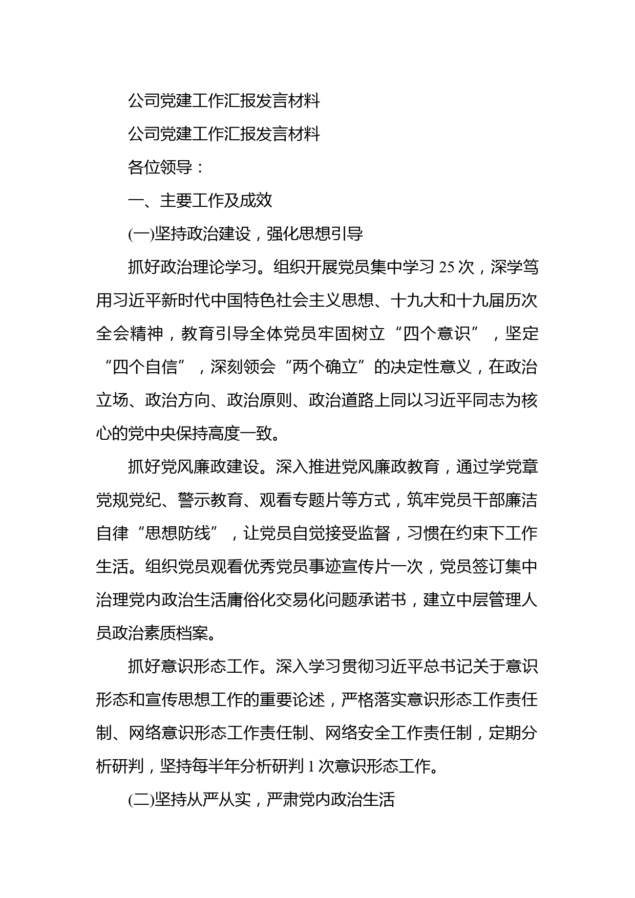公司黨建工作匯報(bào)發(fā)言材料公司黨建工作匯報(bào)發(fā)言材料各位領(lǐng)導(dǎo):一、主要工作及成效(一)堅(jiān)持政治建設(shè),強(qiáng)化思想引導(dǎo)抓好政治理論學(xué)習(xí)。組織開展黨員集中學(xué)習(xí)25次,深學(xué)篤用習(xí)近平新時(shí)代中國特色社會(huì)主義思想、十九大和十九屆歷次全會(huì)精神,教育引導(dǎo)全體黨員牢固樹立“四個(gè)意識(shí)”,堅(jiān)定“四個(gè)自信”,深刻領(lǐng)會(huì)“兩個(gè)確立”的決定性意義,在政治立場、政治方向、政治原則、政治道路上同以習(xí)近平同志為核心的黨中央保持高度一致。抓好黨風(fēng)廉政建設(shè)。深入推進(jìn)黨風(fēng)廉政教育,通過學(xué)黨章黨規(guī)黨紀(jì)、警示教育、觀看專題片等方式,筑牢黨員干部廉潔自律“思想防線”,讓黨員自覺接受...