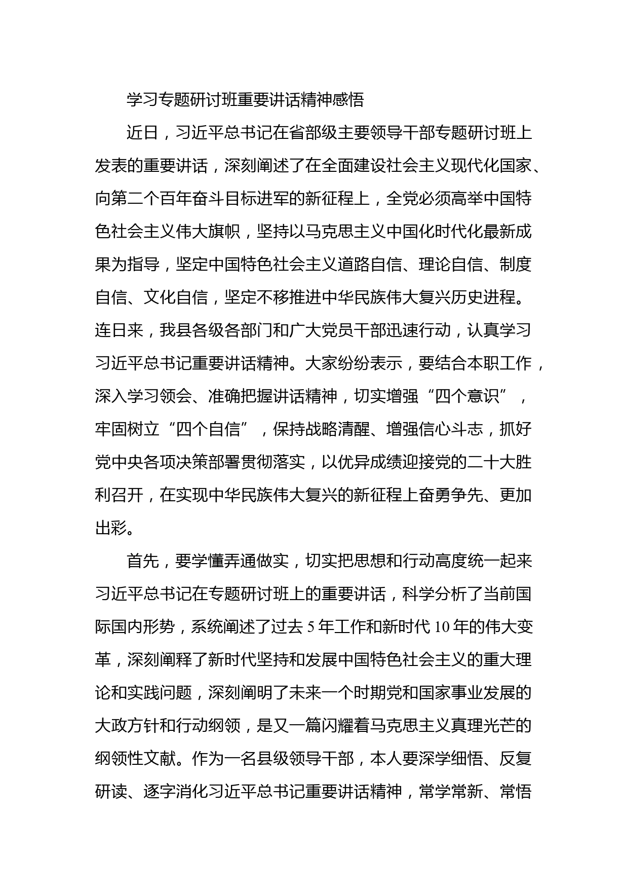 學習專題研討班重要講話精神感悟近日,習近平總書記在省部級主要領導干部專題研討班上發(fā)表的重要講話,深刻闡述了在全面建設社會主義現(xiàn)代化國家、向第二個百年奮斗目標進軍的新征程上,全黨必須高舉中國特色社會主義偉大旗幟,堅持以馬克思主義中國化時代化最新成果為指導,堅定中國特色社會主義道路自信、理論自信、制度自信、文化自信,堅定不移推進中華民族偉大復興歷史進程。連日來,我縣各級各部門和廣大黨員干部迅速行動,認真學習習近平總書記重要講話精神。大家紛紛表示,要結(jié)合本職工作,深入學習領會、準確把握講話精神,切實增強“四個意識”,牢固樹立“四個...