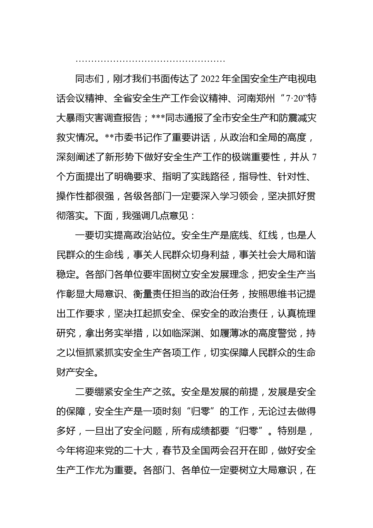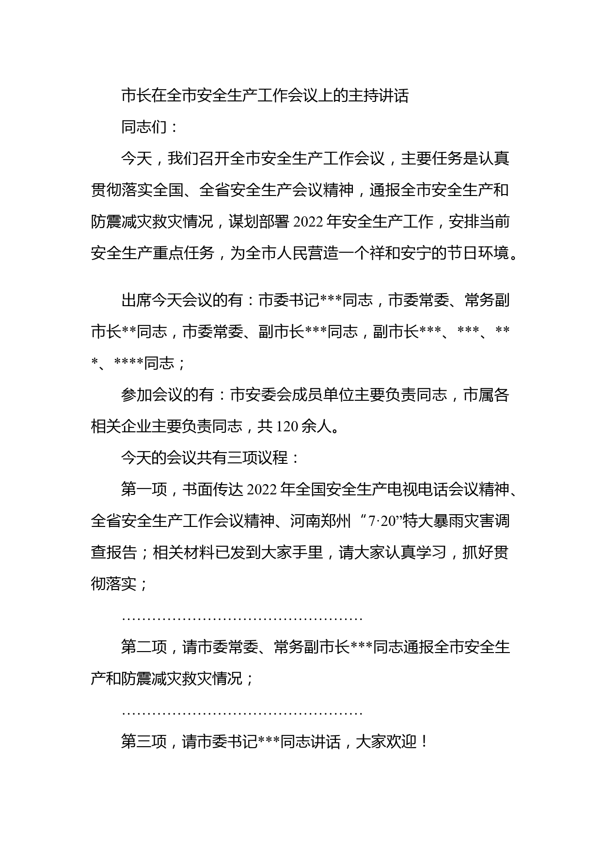市長(zhǎng)在全市安全生產(chǎn)工作會(huì)議上的主持講話同志們:今天,我們召開全市安全生產(chǎn)工作會(huì)議,主要任務(wù)是認(rèn)真貫徹落實(shí)全國(guó)、全省安全生產(chǎn)會(huì)議精神,通報(bào)全市安全生產(chǎn)和防震減災(zāi)救災(zāi)情況,謀劃部署2022年安全生產(chǎn)工作,安排當(dāng)前安全生產(chǎn)重點(diǎn)任務(wù),為全市人民營(yíng)造一個(gè)祥和安寧的節(jié)日環(huán)境。出席今天會(huì)議的有:市委書記同志,市委常委、常務(wù)副市長(zhǎng)同志,市委常委、副市長(zhǎng)同志,副市長(zhǎng)、、、同志;參加會(huì)議的有:市安委會(huì)成員單位主要負(fù)責(zé)同志,市屬各相關(guān)企業(yè)主要負(fù)責(zé)同志,共120余人。今天的會(huì)議共有三項(xiàng)議程:第一項(xiàng),書面?zhèn)鬟_(dá)2022年全國(guó)安全生產(chǎn)電視電話會(huì)議精神、全省安全生產(chǎn)...