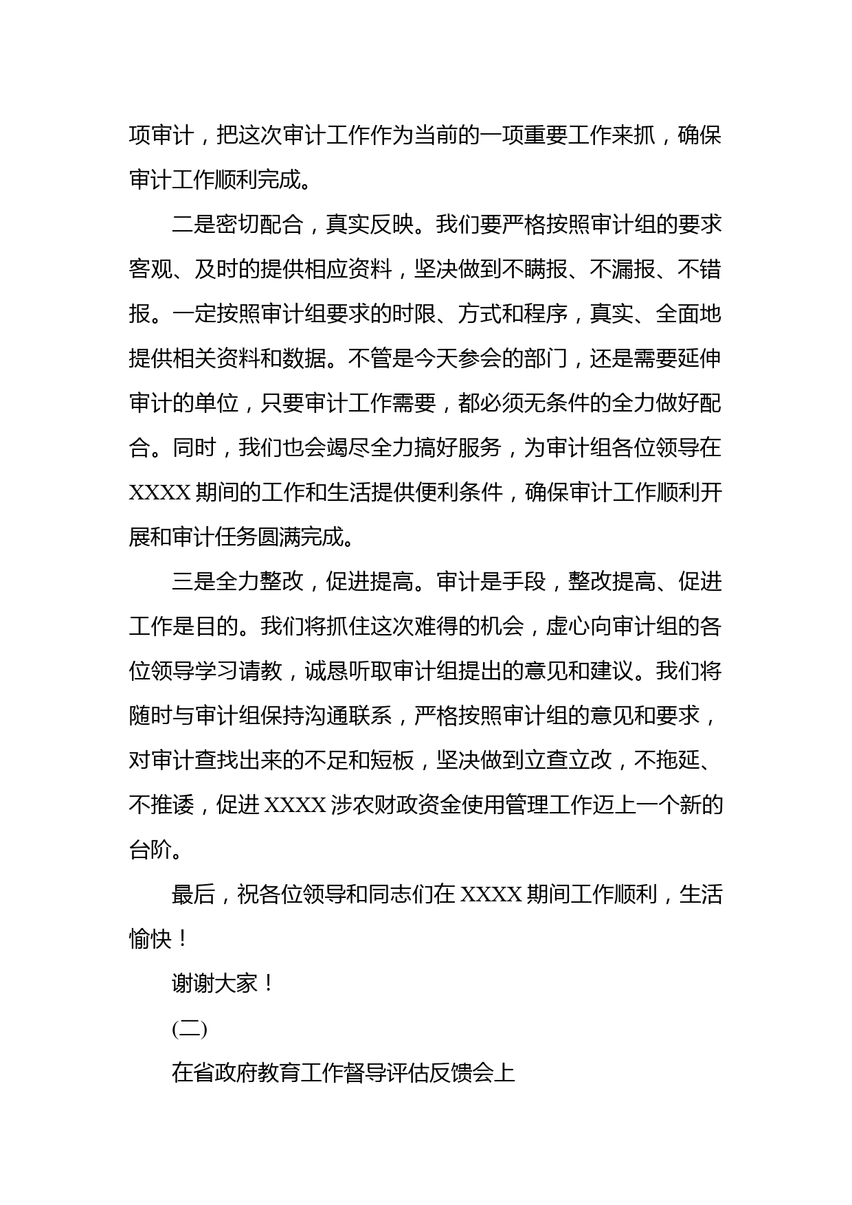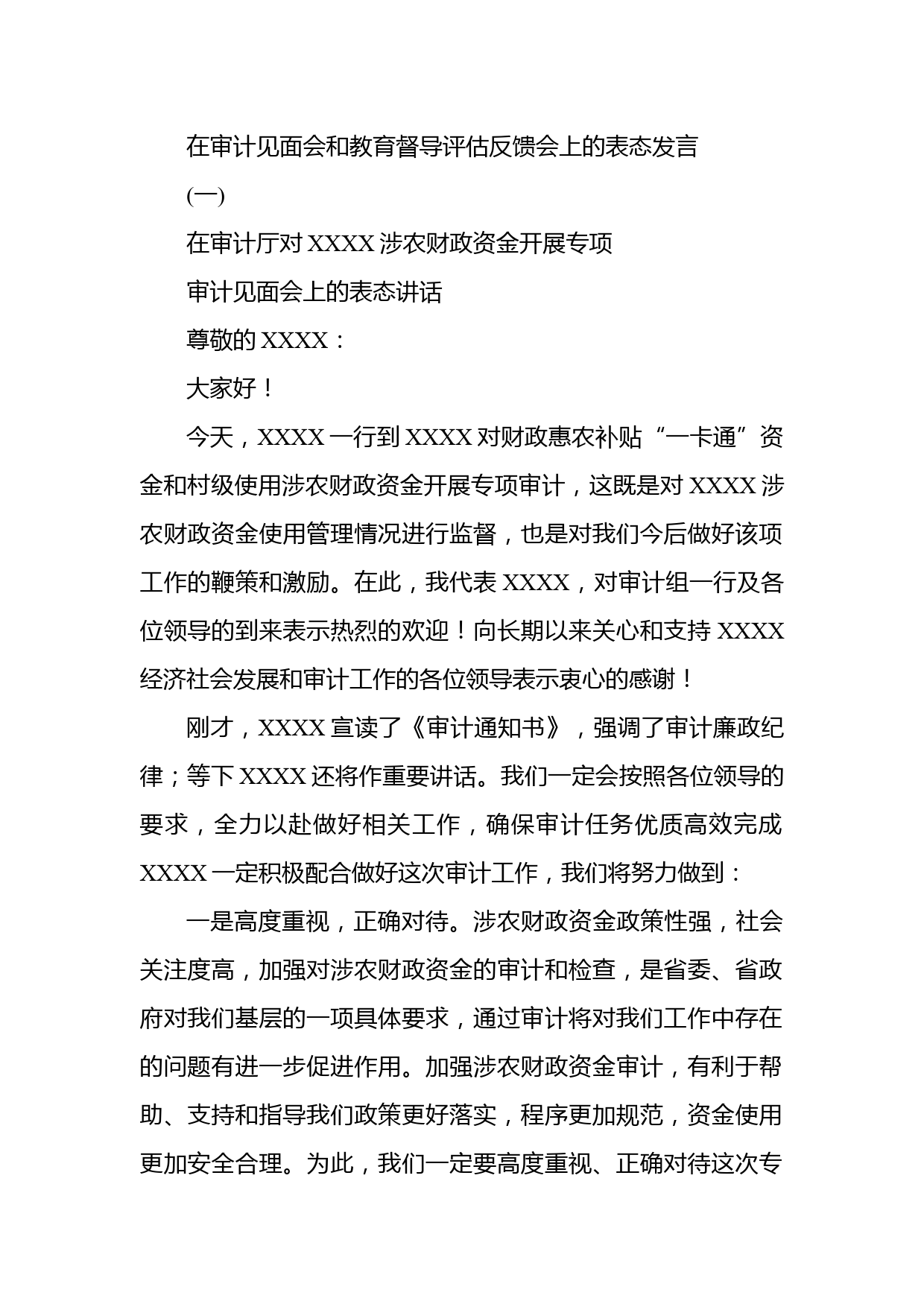在審計見面會和教育督導評估反饋會上的表態(tài)發(fā)言(一)在審計廳對XXXX涉農財政資金開展專項審計見面會上的表態(tài)講話尊敬的XXXX:大家好!今天,XXXX一行到XXXX對財政惠農補貼“一卡通”資金和村級使用涉農財政資金開展專項審計,這既是對XXXX涉農財政資金使用管理情況進行監(jiān)督,也是對我們今后做好該項工作的鞭策和激勵。在此,我代表XXXX,對審計組一行及各位領導的到來表示熱烈的歡迎!向長期以來關心和支持XXXX經濟社會發(fā)展和審計工作的各位領導表示衷心的感謝!剛才,XXXX宣讀了《審計通知書》,強調了審計廉政紀律;等下XXXX還將作重要講話。我們一定會按照各位領導的要...