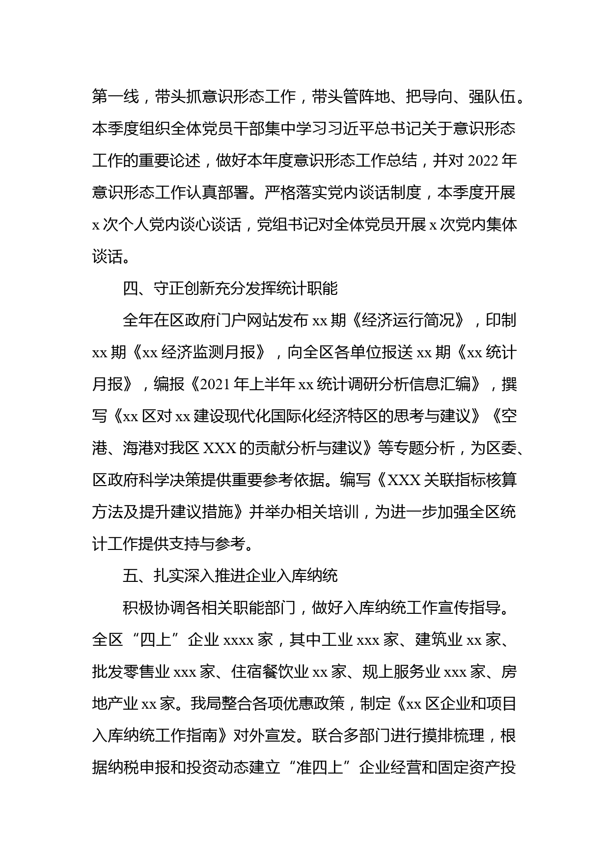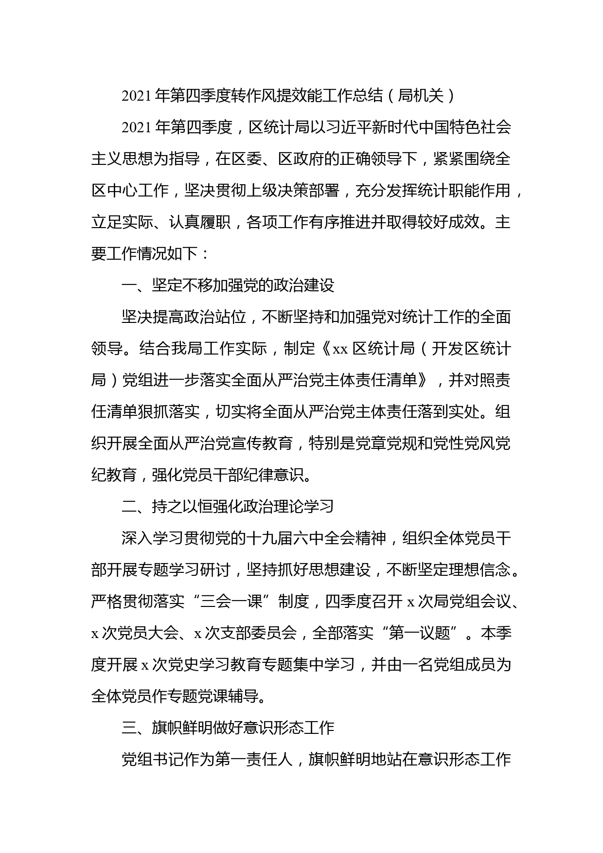 2021年第四季度轉(zhuǎn)作風(fēng)提效能工作總結(jié)(局機(jī)關(guān))2021年第四季度,區(qū)統(tǒng)計(jì)局以習(xí)近平新時(shí)代中國特色社會(huì)主義思想為指導(dǎo),在區(qū)委、區(qū)政府的正確領(lǐng)導(dǎo)下,緊緊圍繞全區(qū)中心工作,堅(jiān)決貫徹上級(jí)決策部署,充分發(fā)揮統(tǒng)計(jì)職能作用,立足實(shí)際、認(rèn)真履職,各項(xiàng)工作有序推進(jìn)并取得較好成效。主要工作情況如下:一、堅(jiān)定不移加強(qiáng)黨的政治建設(shè)堅(jiān)決提高政治站位,不斷堅(jiān)持和加強(qiáng)黨對(duì)統(tǒng)計(jì)工作的全面領(lǐng)導(dǎo)。結(jié)合我局工作實(shí)際,制定《xx區(qū)統(tǒng)計(jì)局(開發(fā)區(qū)統(tǒng)計(jì)局)黨組進(jìn)一步落實(shí)全面從嚴(yán)治黨主體責(zé)任清單》,并對(duì)照責(zé)任清單狠抓落實(shí),切實(shí)將全面從嚴(yán)治黨主體責(zé)任落到實(shí)處。組織開展全面從嚴(yán)治黨...