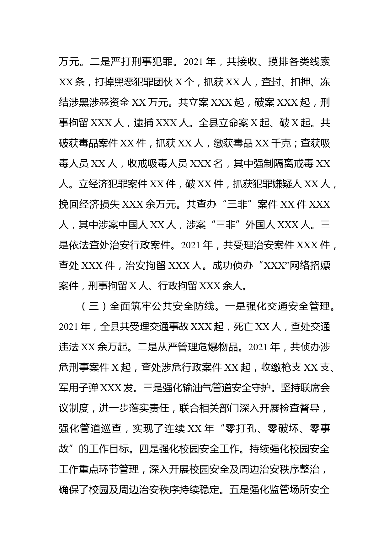 縣公安局2021年度工作情況總結(jié)2021年以來,在縣委、縣政府和市公安局黨委的堅(jiān)強(qiáng)領(lǐng)導(dǎo)下,在人大、政協(xié)的監(jiān)督指導(dǎo)下,在各級各部門、社會(huì)各界和廣大群眾的鼎力支持下,縣公安局緊扣全縣經(jīng)濟(jì)社會(huì)發(fā)展大局和市公安局黨委的決策部署,忠誠履職盡責(zé),不斷破解難題,全力推進(jìn)抗疫情、防風(fēng)險(xiǎn)、護(hù)穩(wěn)定、保安全、助發(fā)展各項(xiàng)措施的落實(shí),確保了全縣政治安全、社會(huì)安定、人民安寧。現(xiàn)將工作情況總結(jié)如下:一、2021年工作總結(jié)(一)全力維護(hù)社會(huì)安全穩(wěn)定。一是加強(qiáng)情報(bào)信息收集處置工作,確保了重大活動(dòng)、重要敏感節(jié)點(diǎn)和節(jié)假日期間社會(huì)安全。二是始終把警務(wù)站查緝作為政治責(zé)任,嚴(yán)守反...