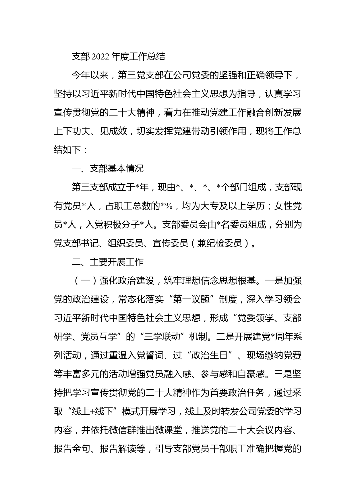 支部2022年度工作總結(jié)今年以來,第三黨支部在公司黨委的堅(jiān)強(qiáng)和正確領(lǐng)導(dǎo)下,堅(jiān)持以習(xí)近平新時代中國特色社會主義思想為指導(dǎo),認(rèn)真學(xué)習(xí)宣傳貫徹黨的二十大精神,著力在推動黨建工作融合創(chuàng)新發(fā)展上下功夫、見成效,切實(shí)發(fā)揮黨建帶動引領(lǐng)作用,現(xiàn)將工作總結(jié)如下:一、支部基本情況第三支部成立于年,現(xiàn)由、、、個部門組成,支部現(xiàn)有黨員人,占職工總數(shù)的%,均為大專及以上學(xué)歷;女性黨員人,入黨積極分子人。支部委員會由名委員組成,分別為黨支部書記、組織委員、宣傳委員(兼紀(jì)檢委員)。二、主要開展工作(一)強(qiáng)化政治建設(shè),筑牢理想信念思想根基。一是加強(qiáng)黨的政治建設(shè)...