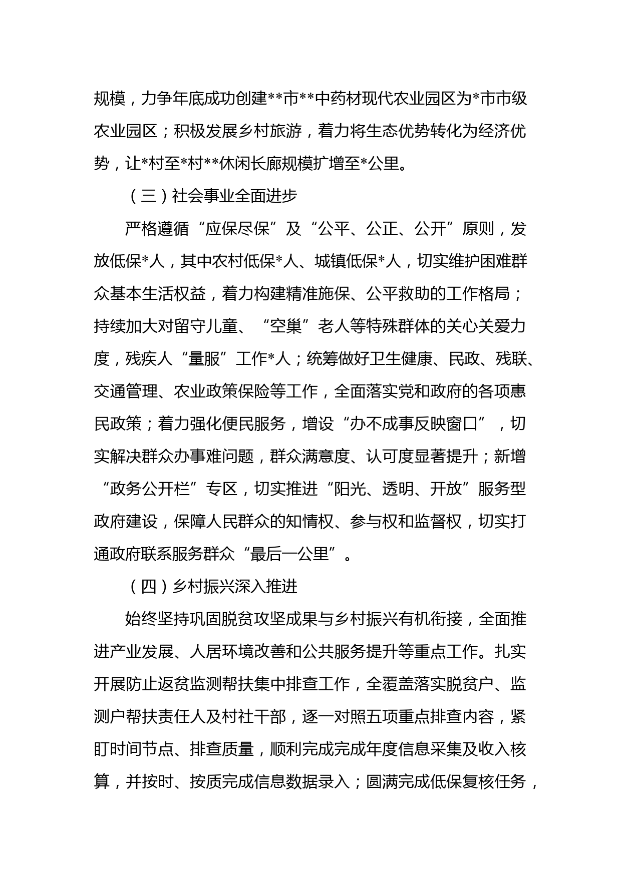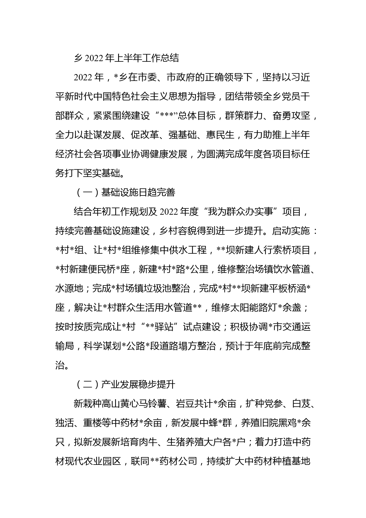 鄉(xiāng)2022年上半年工作總結2022年,鄉(xiāng)在市委、市政府的正確領導下,堅持以習近平新時代中國特色社會主義思想為指導,團結帶領全鄉(xiāng)黨員干部群眾,緊緊圍繞建設“”總體目標,群策群力、奮勇攻堅,全力以赴謀發(fā)展、促改革、強基礎、惠民生,有力助推上半年經濟社會各項事業(yè)協(xié)調健康發(fā)展,為圓滿完成年度各項目標任務打下堅實基礎。(一)基礎設施日趨完善結合年初工作規(guī)劃及2022年度“我為群眾辦實事”項目,持續(xù)完善基礎設施建設,鄉(xiāng)村容貌得到進一步提升。啟動實施:村組、讓村組維修集中供水工程,壩新建人行索橋項目,村新建便民橋座,新建村路公里,維修整治場鎮(zhèn)飲水管道...