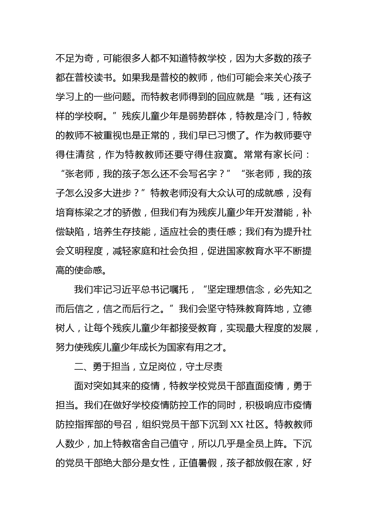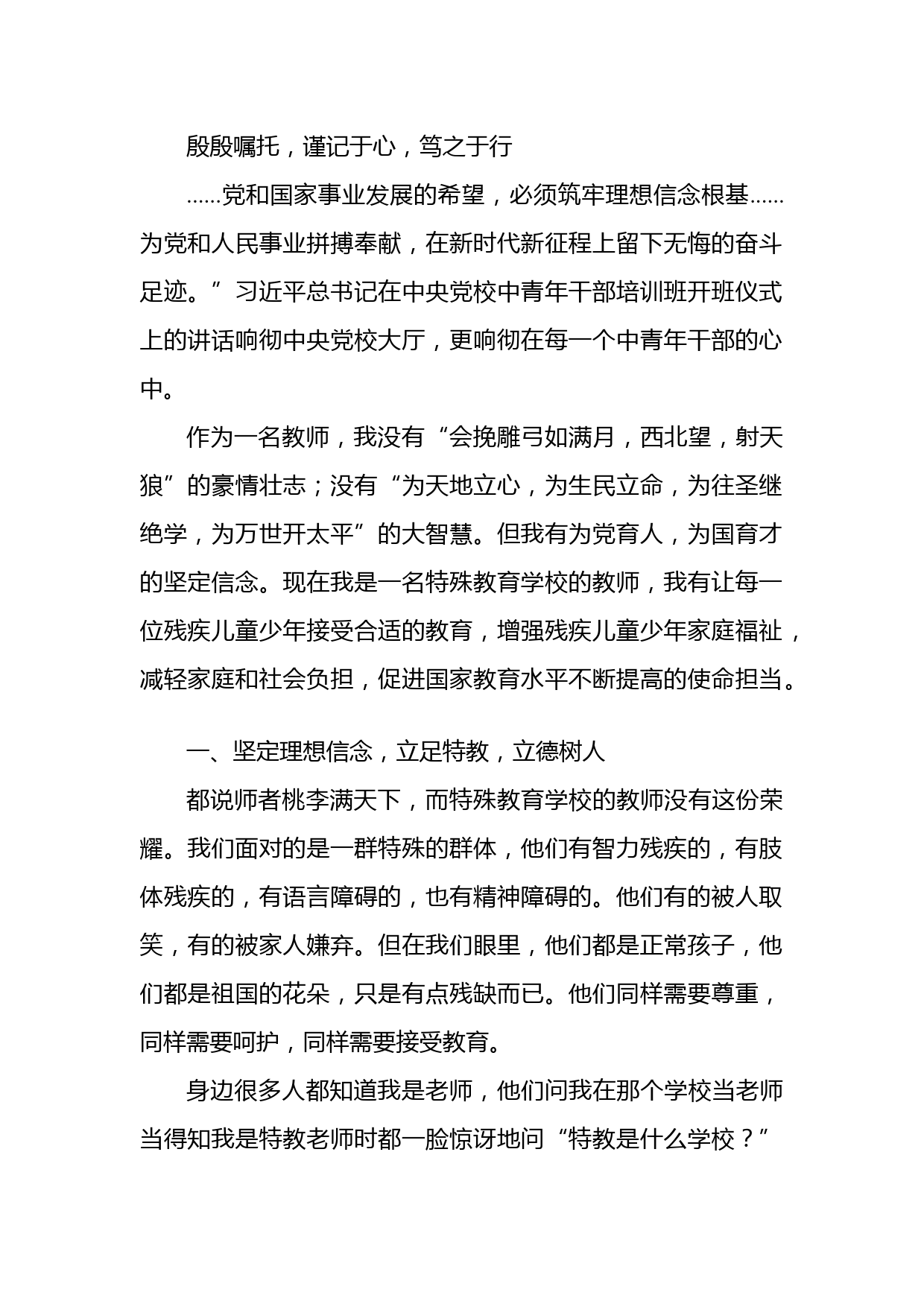 殷殷囑托,謹(jǐn)記于心,篤之于行......黨和國家事業(yè)發(fā)展的希望,必須筑牢理想信念根基......為黨和人民事業(yè)拼搏奉獻,在新時代新征程上留下無悔的奮斗足跡?!绷?xí)近平總書記在中央黨校中青年干部培訓(xùn)班開班儀式上的講話響徹中央黨校大廳,更響徹在每一個中青年干部的心中。作為一名教師,我沒有“會挽雕弓如滿月,西北望,射天狼”的豪情壯志;沒有“為天地立心,為生民立命,為往圣繼絕學(xué),為萬世開太平”的大智慧。但我有為黨育人,為國育才的堅定信念。現(xiàn)在我是一名特殊教育學(xué)校的教師,我有讓每一位殘疾兒童少年接受合適的教育,增強殘疾兒童少年家庭福祉,減輕家庭和社...