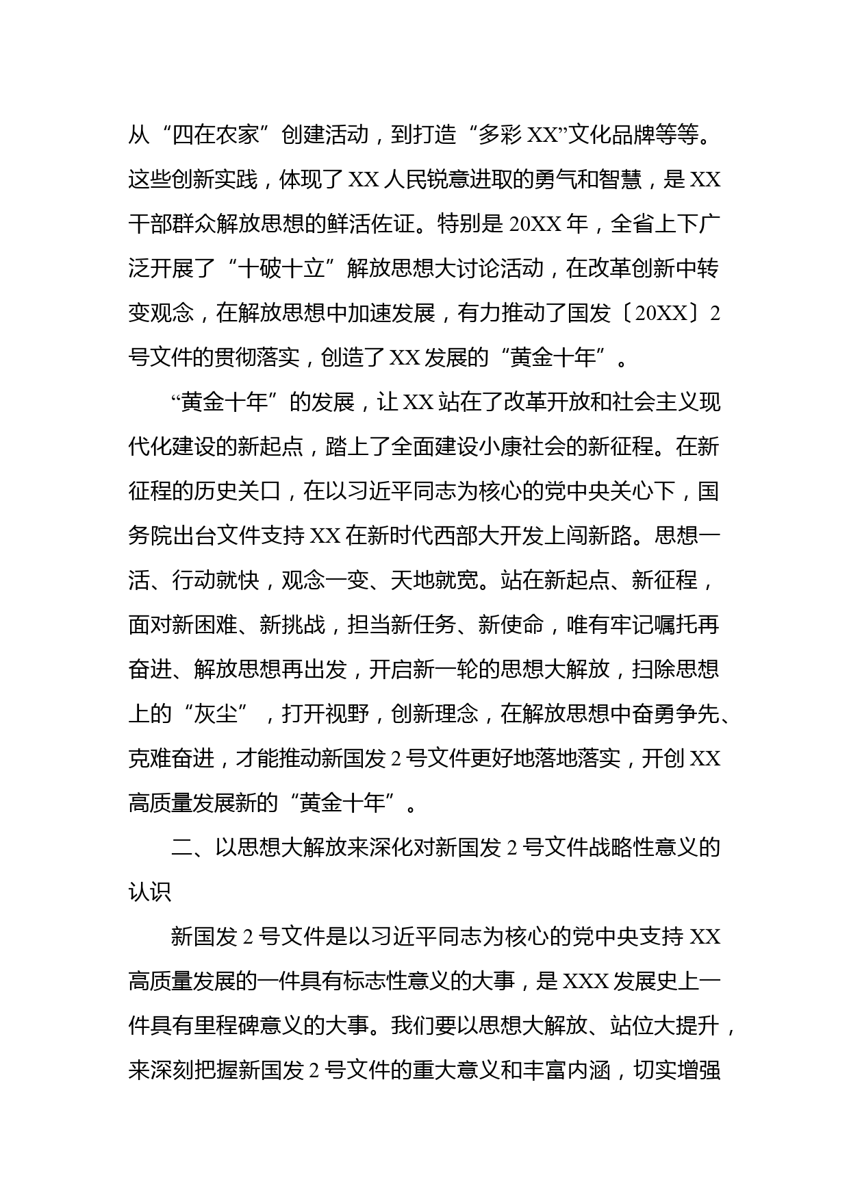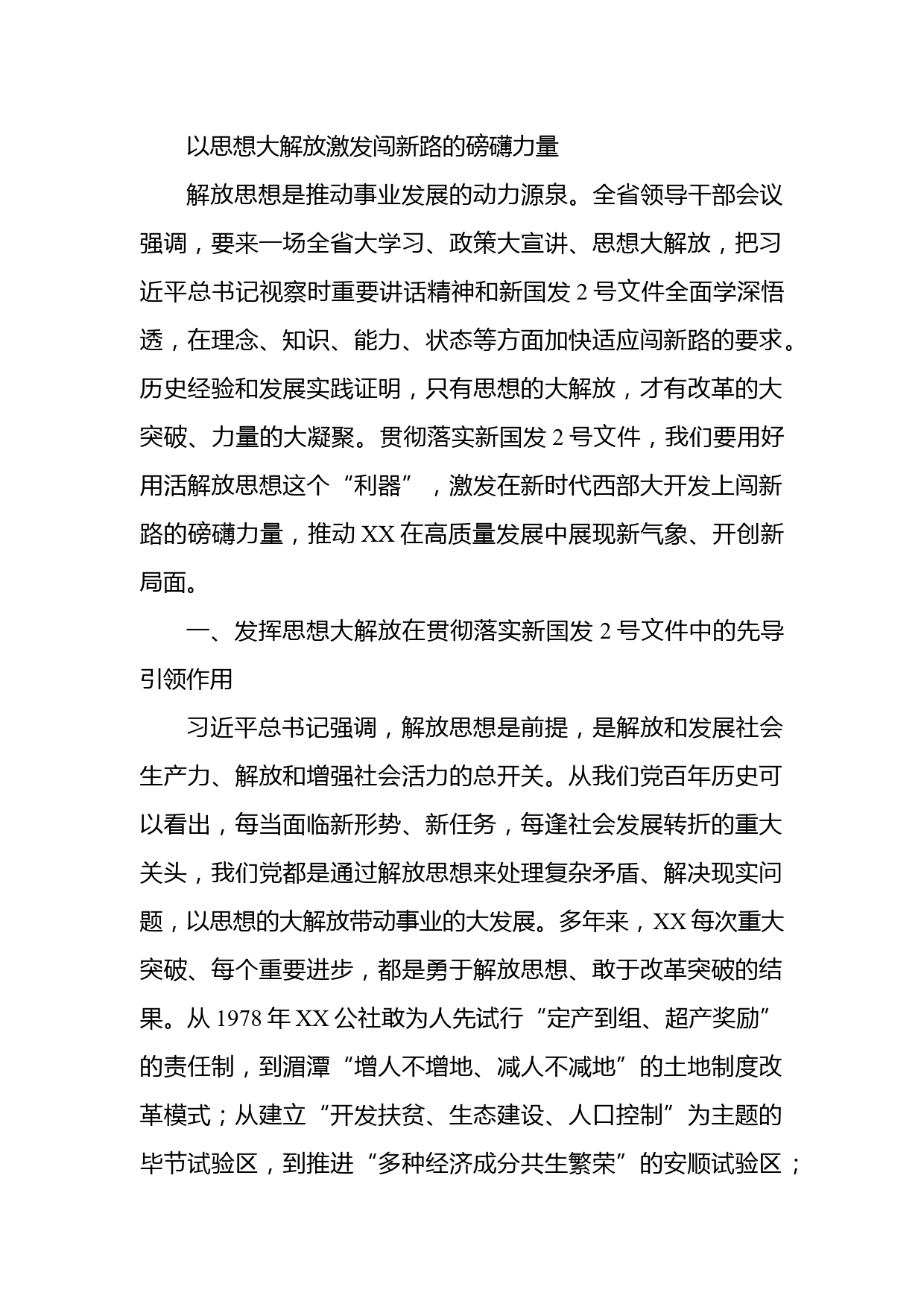 以思想大解放激發(fā)闖新路的磅礴力量解放思想是推動(dòng)事業(yè)發(fā)展的動(dòng)力源泉。全省領(lǐng)導(dǎo)干部會議強(qiáng)調(diào),要來一場全省大學(xué)習(xí)、政策大宣講、思想大解放,把習(xí)近平總書記視察時(shí)重要講話精神和新國發(fā)2號文件全面學(xué)深悟透,在理念、知識、能力、狀態(tài)等方面加快適應(yīng)闖新路的要求。歷史經(jīng)驗(yàn)和發(fā)展實(shí)踐證明,只有思想的大解放,才有改革的大突破、力量的大凝聚。貫徹落實(shí)新國發(fā)2號文件,我們要用好用活解放思想這個(gè)“利器”,激發(fā)在新時(shí)代西部大開發(fā)上闖新路的磅礴力量,推動(dòng)XX在高質(zhì)量發(fā)展中展現(xiàn)新氣象、開創(chuàng)新局面。一、發(fā)揮思想大解放在貫徹落實(shí)新國發(fā)2號文件中的先導(dǎo)引領(lǐng)作用習(xí)近平總...