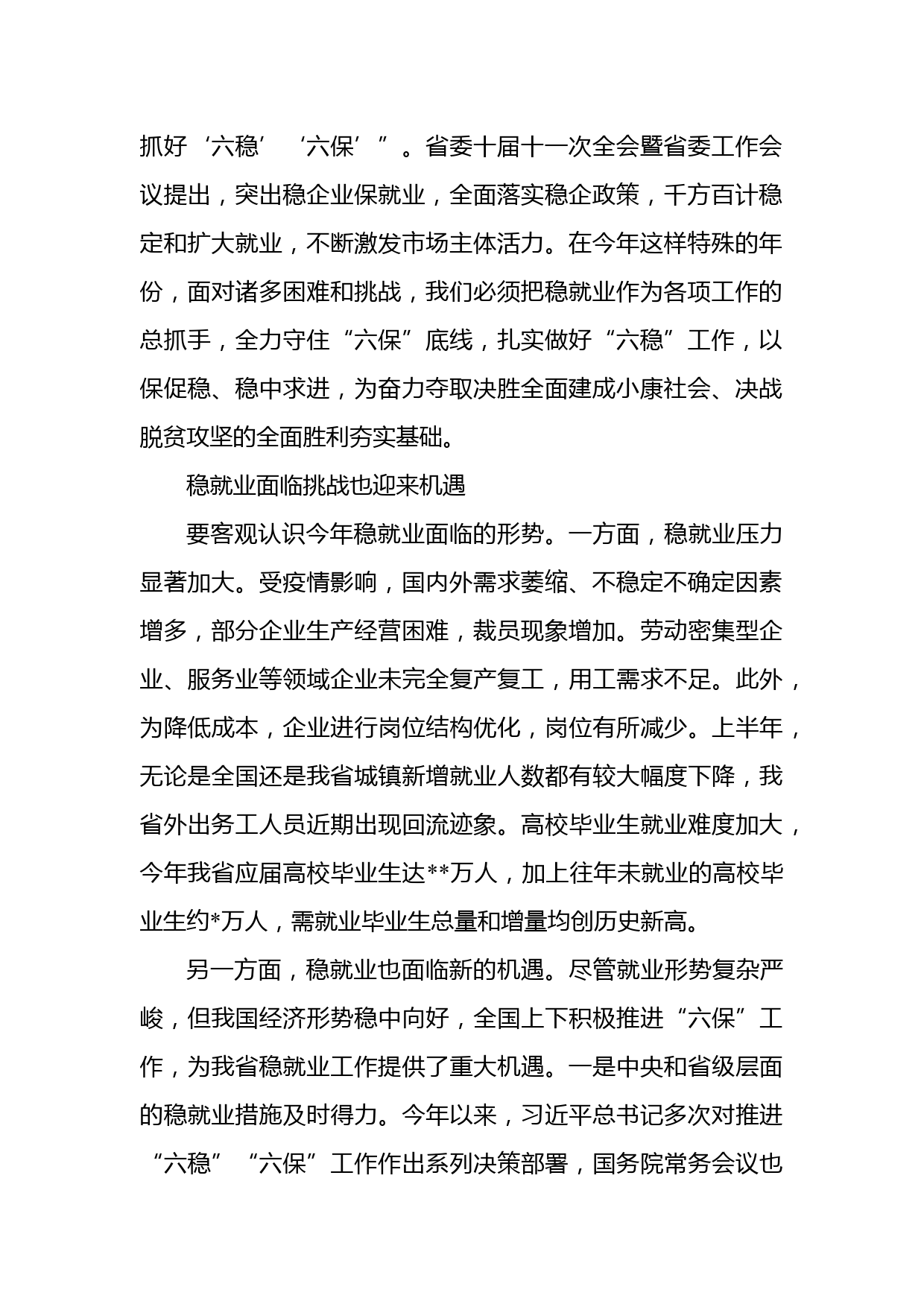 關(guān)于以穩(wěn)就業(yè)為重點(diǎn)守住“六?!钡拙€的思考省委十屆十一次全會(huì)暨省委工作會(huì)議強(qiáng)調(diào),要以習(xí)近平新時(shí)代中國(guó)特色社會(huì)主義思想為指導(dǎo),堅(jiān)持穩(wěn)中求進(jìn)工作總基調(diào),扎實(shí)做好“六穩(wěn)”工作,全面落實(shí)“六保”任務(wù),確保完成決勝全面建成小康社會(huì)、決戰(zhàn)脫貧攻堅(jiān)目標(biāo)任務(wù)。就業(yè)是“六穩(wěn)”“六?!钡牡谝晃蝗蝿?wù),是最大的民生工程、民心工程、根基工程。今年以來(lái),受新冠肺炎疫情影響,全省就業(yè)形勢(shì)嚴(yán)峻復(fù)雜,經(jīng)濟(jì)下行和疫情的疊加影響不容忽視,影響就業(yè)的不穩(wěn)定不確定因素增多,面臨的風(fēng)險(xiǎn)和挑戰(zhàn)加大,因此更需要以就業(yè)為重點(diǎn),著力在“?!鄙舷鹿Ψ?,守住經(jīng)濟(jì)社會(huì)發(fā)展的底線。就業(yè)...