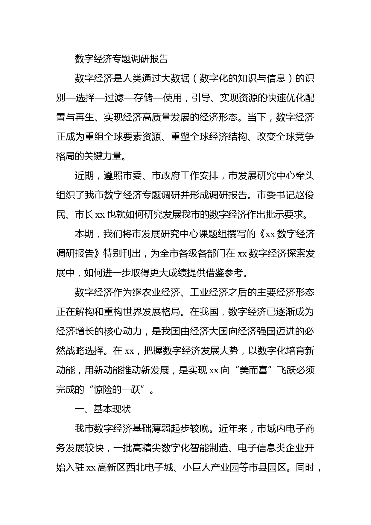 數(shù)字經(jīng)濟(jì)專題調(diào)研報(bào)告數(shù)字經(jīng)濟(jì)是人類通過大數(shù)據(jù)(數(shù)字化的知識(shí)與信息)的識(shí)別—選擇—過濾—存儲(chǔ)—使用,引導(dǎo)、實(shí)現(xiàn)資源的快速優(yōu)化配置與再生、實(shí)現(xiàn)經(jīng)濟(jì)高質(zhì)量發(fā)展的經(jīng)濟(jì)形態(tài)。當(dāng)下,數(shù)字經(jīng)濟(jì)正成為重組全球要素資源、重塑全球經(jīng)濟(jì)結(jié)構(gòu)、改變?nèi)蚋?jìng)爭(zhēng)格局的關(guān)鍵力量。近期,遵照市委、市政府工作安排,市發(fā)展研究中心牽頭組織了我市數(shù)字經(jīng)濟(jì)專題調(diào)研并形成調(diào)研報(bào)告。市委書記趙俊民、市長(zhǎng)xx也就如何研究發(fā)展我市的數(shù)字經(jīng)濟(jì)作出批示要求。本期,我們將市發(fā)展研究中心課題組撰寫的《xx數(shù)字經(jīng)濟(jì)調(diào)研報(bào)告》特別刊出,為全市各級(jí)各部門在xx數(shù)字經(jīng)濟(jì)探索發(fā)展中,如何進(jìn)一步取得...