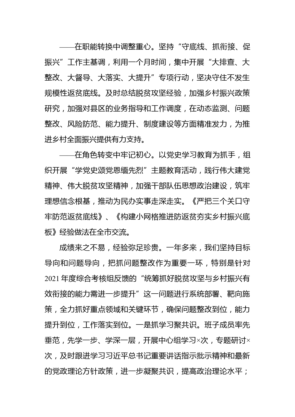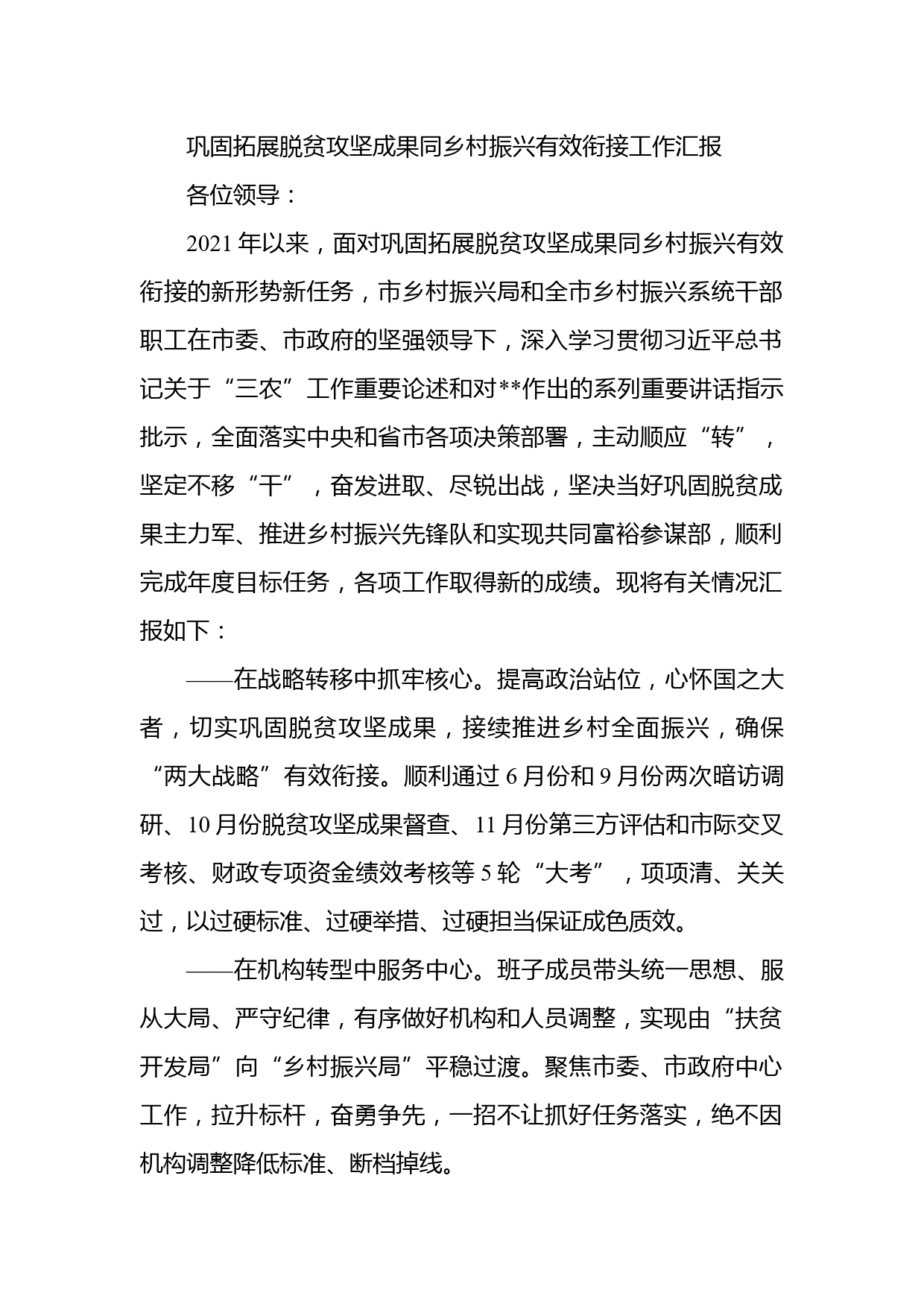 鞏固拓展脫貧攻堅(jiān)成果同鄉(xiāng)村振興有效銜接工作匯報(bào)各位領(lǐng)導(dǎo):2021年以來,面對鞏固拓展脫貧攻堅(jiān)成果同鄉(xiāng)村振興有效銜接的新形勢新任務(wù),市鄉(xiāng)村振興局和全市鄉(xiāng)村振興系統(tǒng)干部職工在市委、市政府的堅(jiān)強(qiáng)領(lǐng)導(dǎo)下,深入學(xué)習(xí)貫徹習(xí)近平總書記關(guān)于“三農(nóng)”工作重要論述和對作出的系列重要講話指示批示,全面落實(shí)中央和省市各項(xiàng)決策部署,主動(dòng)順應(yīng)“轉(zhuǎn)”,堅(jiān)定不移“干”,奮發(fā)進(jìn)取、盡銳出戰(zhàn),堅(jiān)決當(dāng)好鞏固脫貧成果主力軍、推進(jìn)鄉(xiāng)村振興先鋒隊(duì)和實(shí)現(xiàn)共同富裕參謀部,順利完成年度目標(biāo)任務(wù),各項(xiàng)工作取得新的成績?,F(xiàn)將有關(guān)情況匯報(bào)如下:——在戰(zhàn)略轉(zhuǎn)移中抓牢核心。提高政治站位,...