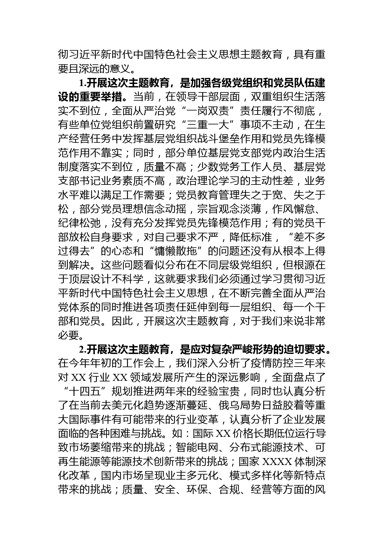 在2023年主題教育動(dòng)員部署會(huì)上的講話同志們:以縣處級(jí)以上領(lǐng)導(dǎo)干部為重點(diǎn)在全黨深入開展學(xué)習(xí)貫徹新時(shí)代中國(guó)特色社會(huì)主義思想主題教育,是貫徹落實(shí)黨的二十大精神的重大舉措。4月3日,中央學(xué)習(xí)貫徹習(xí)近平新時(shí)代中國(guó)特色社會(huì)主義思想主題教育工作會(huì)議召開,習(xí)近平總書記做了重要講話。4月XX日,集團(tuán)公司黨組召開動(dòng)員部署會(huì)并下發(fā)實(shí)施方案,對(duì)主題教育進(jìn)行安排部署。剛才XX副書記傳達(dá)了集團(tuán)公司主題教育安排部署會(huì)議的主要精神,XX部長(zhǎng)通報(bào)了XXX(本單位)主題教育實(shí)施方案,明確了目標(biāo)要求和主要措施。各單位黨委要嚴(yán)格按照方案要求,切實(shí)將思想和行動(dòng)統(tǒng)一到上級(jí)黨組織的決...