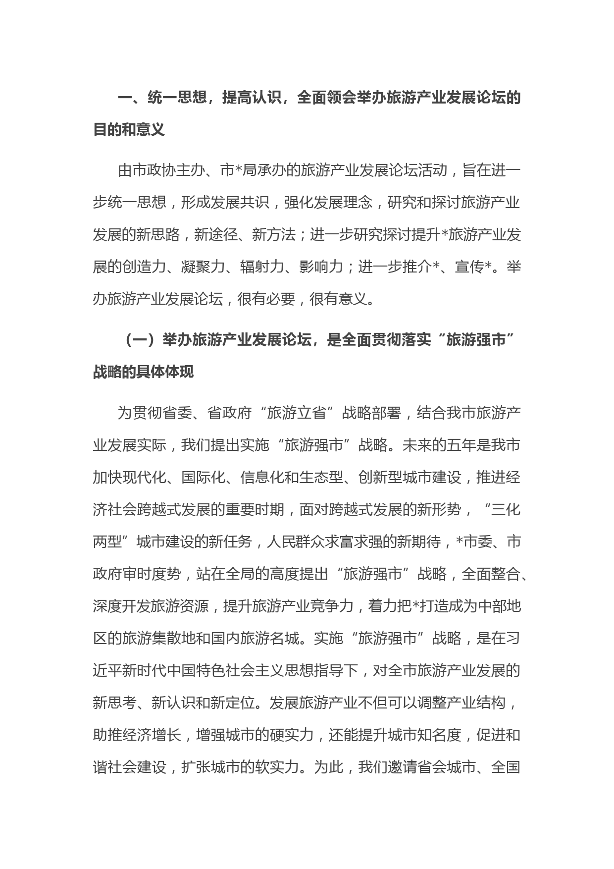 在2022旅游產(chǎn)業(yè)發(fā)展論壇協(xié)調(diào)會上的講話同志們:今天我們在這里召開?旅游產(chǎn)業(yè)發(fā)展論壇協(xié)調(diào)會,目的就是對舉辦這次論壇活動進行動員和部署。所以這既是一次協(xié)調(diào)會,同時也是一次動員會。剛才,秘書長宣讀了活動方案,向大家傳達了一系列指示精神,并作了十分重要的講話,明確了任務(wù),提出了要求,會后各參加單位要結(jié)合各部門工作實際,認真貫徹落實。我們計劃月份舉辦的旅游產(chǎn)業(yè)發(fā)展論壇活動,是基于我們參加市政協(xié)組織對發(fā)展我市旅游業(yè)的調(diào)研和月份參加市旅游產(chǎn)業(yè)發(fā)展大會時的一個想法,這個想法醞釀很久,也經(jīng)過我深思熟慮。在最近赴江西學(xué)習(xí)考察旅游業(yè)發(fā)展中,我們也深...