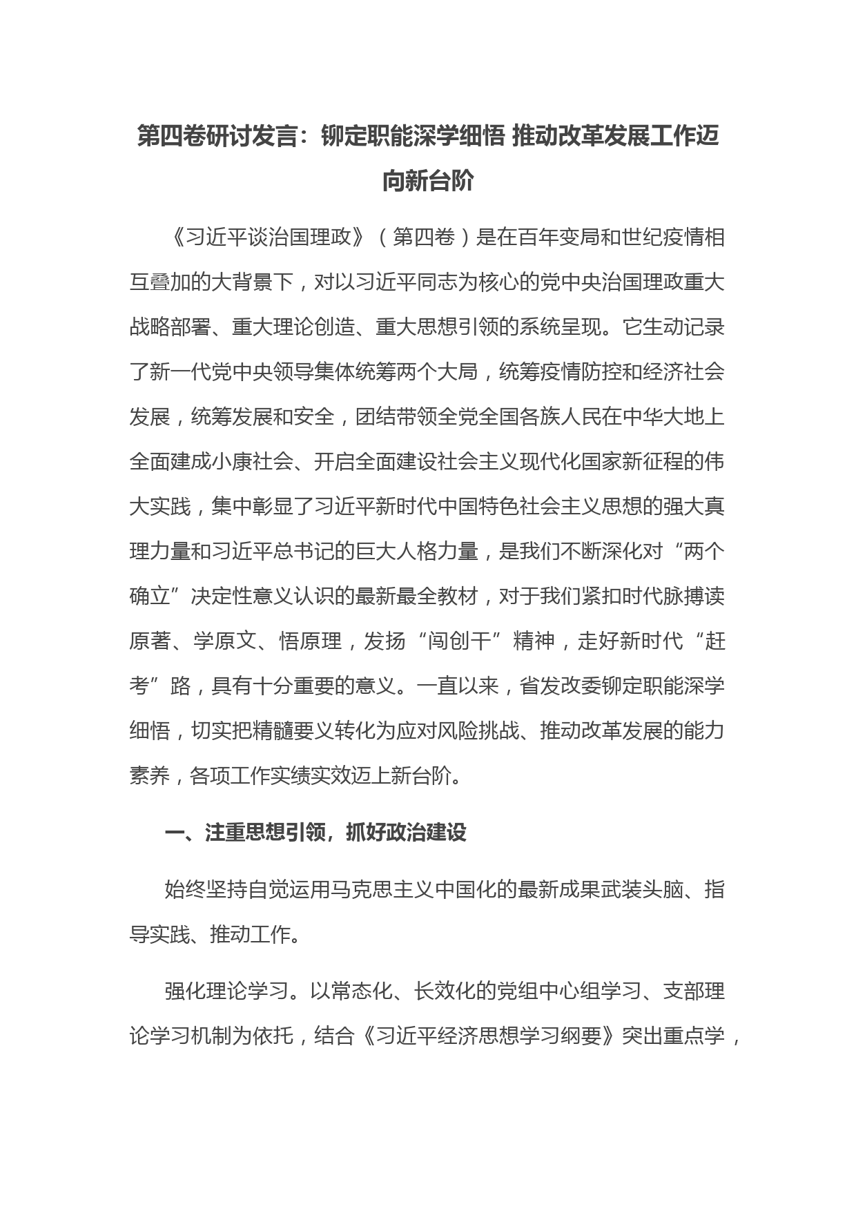第四卷研討發(fā)言:鉚定職能深學(xué)細(xì)悟推動(dòng)改革發(fā)展工作邁向新臺(tái)階《習(xí)近平談治國理政》(第四卷)是在百年變局和世紀(jì)疫情相互疊加的大背景下,對(duì)以習(xí)近平同志為核心的黨中央治國理政重大戰(zhàn)略部署、重大理論創(chuàng)造、重大思想引領(lǐng)的系統(tǒng)呈現(xiàn)。它生動(dòng)記錄了新一代黨中央領(lǐng)導(dǎo)集體統(tǒng)籌兩個(gè)大局,統(tǒng)籌疫情防控和經(jīng)濟(jì)社會(huì)發(fā)展,統(tǒng)籌發(fā)展和安全,團(tuán)結(jié)帶領(lǐng)全黨全國各族人民在中華大地上全面建成小康社會(huì)、開啟全面建設(shè)社會(huì)主義現(xiàn)代化國家新征程的偉大實(shí)踐,集中彰顯了習(xí)近平新時(shí)代中國特色社會(huì)主義思想的強(qiáng)大真理力量和習(xí)近平總書記的巨大人格力量,是我們不斷深化對(duì)“兩個(gè)確立”決定性...