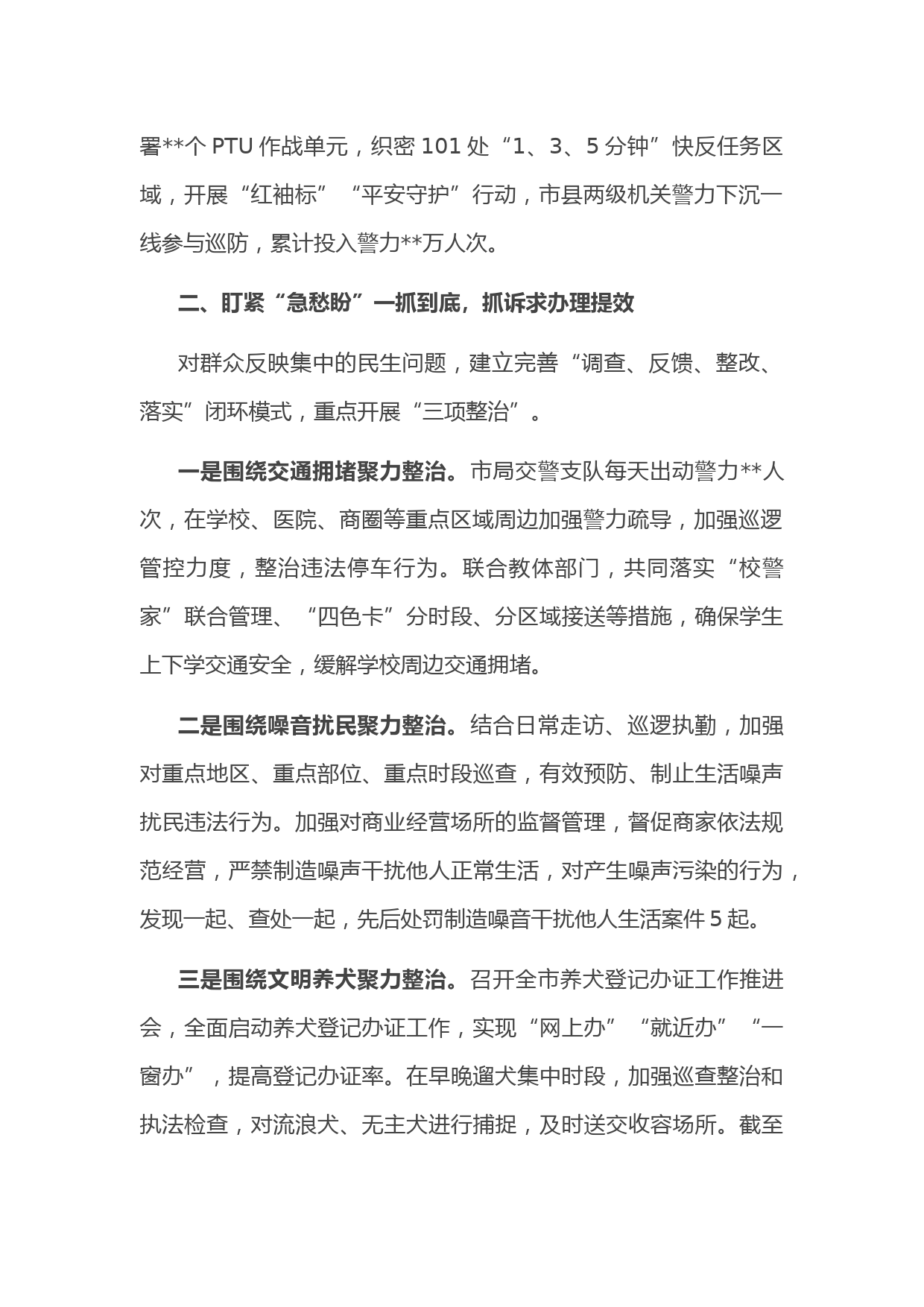 經(jīng)驗(yàn)材料:公安局強(qiáng)力推動(dòng)民生領(lǐng)域突出問(wèn)題整改落實(shí)市公安局始終高度重視民生問(wèn)題,強(qiáng)力開(kāi)展問(wèn)題“大整改”,對(duì)照任務(wù)、問(wèn)題、責(zé)任“三張清單”,狠抓整改措施、整改時(shí)限、整改效果“三個(gè)重點(diǎn)”,抓實(shí)專人、專責(zé)、專辦“三個(gè)環(huán)節(jié)”,排查確定的7大類24方面問(wèn)題扎實(shí)整改、取得實(shí)效。一、堅(jiān)持“打防控”一體推進(jìn),抓群眾滿意提升針對(duì)群眾反映的社會(huì)治安問(wèn)題,堅(jiān)持打、防、管、控綜合施策、一體推進(jìn),提升群眾安全感滿意度。一是抓大案攻堅(jiān)。以夏季社會(huì)治安整治“百日行動(dòng)”和“平安港城”系列行動(dòng)為牽引,縱深推進(jìn)掃黑除惡斗爭(zhēng),快偵快破嚴(yán)重暴力犯罪,今年以來(lái)全市命案發(fā)...