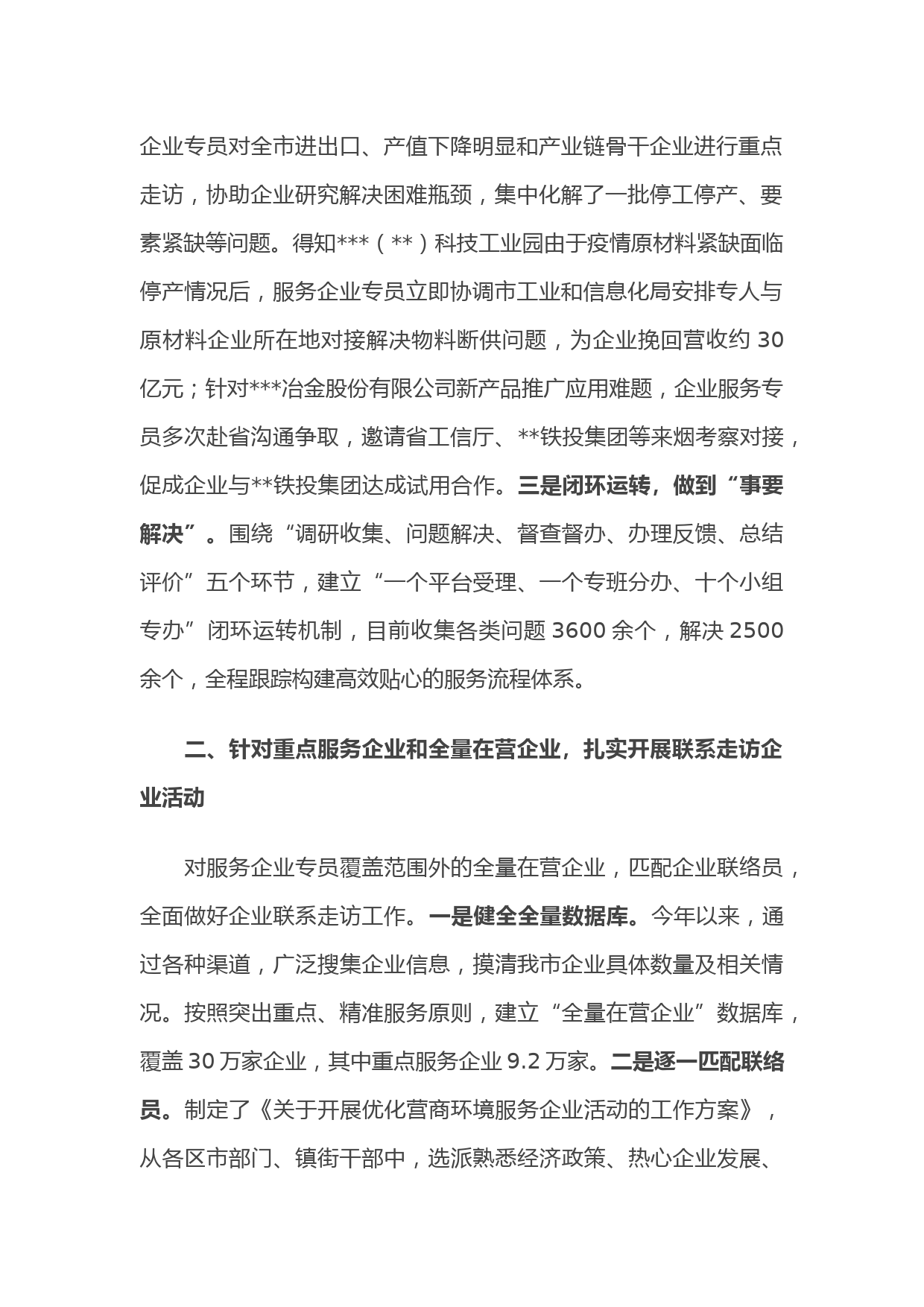 聚焦“多層次、全覆蓋、精準(zhǔn)化”服務(wù)企業(yè)打造有“溫度”的營(yíng)商環(huán)境——在全市政府職能轉(zhuǎn)變和“放管服”改革會(huì)議上交流發(fā)言為從本質(zhì)上優(yōu)化我市營(yíng)商環(huán)境,助力企業(yè)發(fā)展,市營(yíng)轉(zhuǎn)辦以密切政企溝通聯(lián)系、幫助企業(yè)紓困解難為著力點(diǎn),分三個(gè)層面為企業(yè)提供精準(zhǔn)化服務(wù)。通過(guò)主動(dòng)聯(lián)系走訪企業(yè)宣傳政策、了解需求、解決問(wèn)題,有力提升企業(yè)獲得感和滿意度。在年度全省營(yíng)商環(huán)境市場(chǎng)主體滿意度評(píng)價(jià)中,市排名第一。一、針對(duì)工業(yè)企業(yè)和重點(diǎn)企業(yè),全面推行服務(wù)企業(yè)專員制度今年以來(lái),市緊貼企業(yè)發(fā)展需求,精心推出服務(wù)企業(yè)專員制度,為企業(yè)健康發(fā)展保駕護(hù)航。一是頂格推動(dòng),領(lǐng)導(dǎo)帶頭服務(wù)...