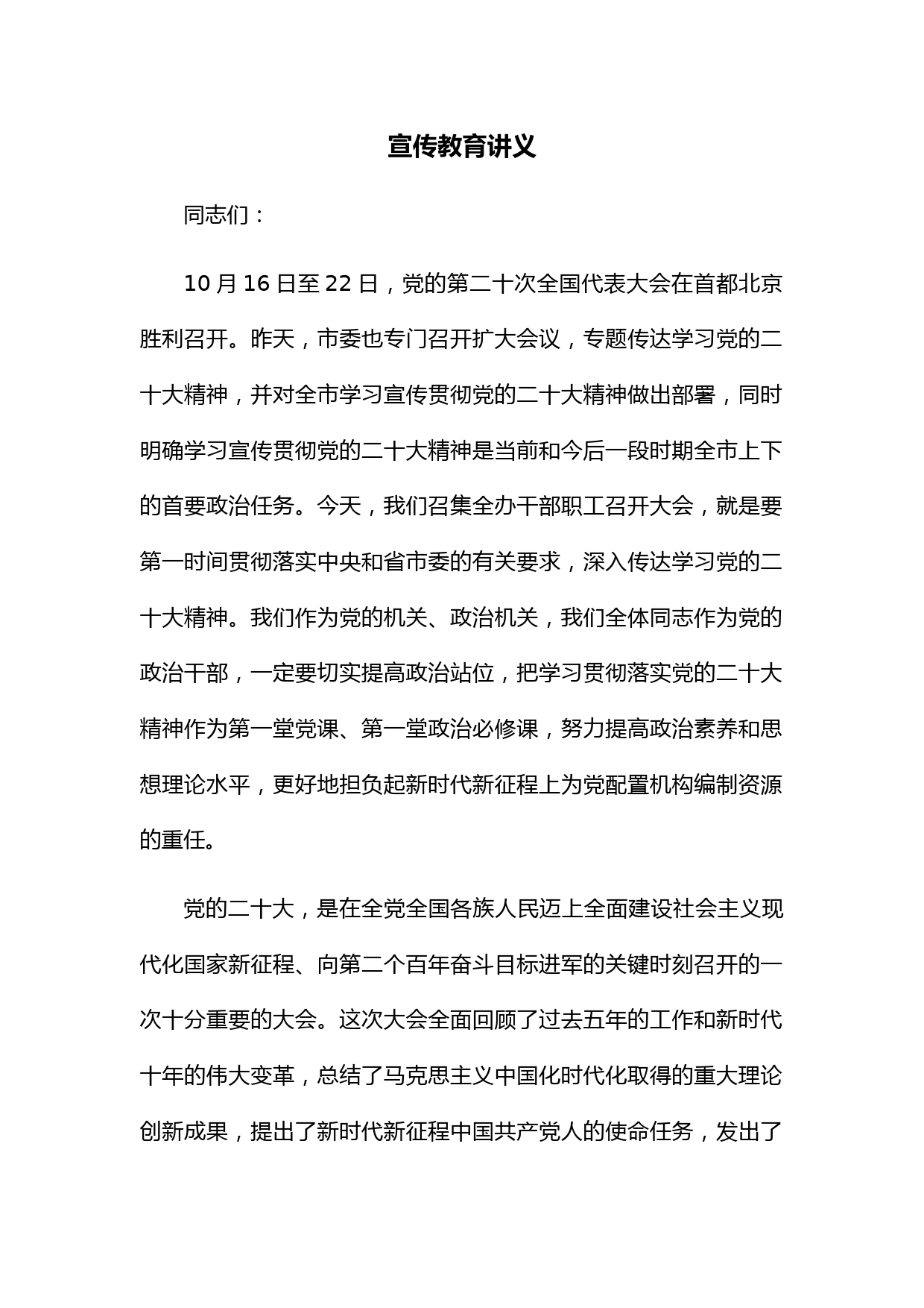 宣傳教育講義同志們:10月16日至22日,黨的第二十次全國代表大會在首都北京勝利召開。昨天,市委也專門召開擴大會議,專題傳達學習黨的二十大精神,并對全市學習宣傳貫徹黨的二十大精神做出部署,同時明確學習宣傳貫徹黨的二十大精神是當前和今后一段時期全市上下的首要政治任務(wù)。今天,我們召集全辦干部職工召開大會,就是要第一時間貫徹落實中央和省市委的有關(guān)要求,深入傳達學習黨的二十大精神。我們作為黨的機關(guān)、政治機關(guān),我們?nèi)w同志作為黨的政治干部,一定要切實提高政治站位,把學習貫徹落實黨的二十大精神作為第一堂黨課、第一堂政治必修課,努力提高政治素養(yǎng)...