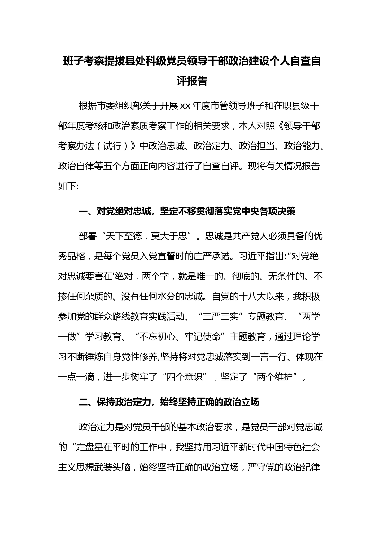 班子考察提拔縣處科級(jí)黨員領(lǐng)導(dǎo)干部政治建設(shè)個(gè)人自查自評(píng)報(bào)告根據(jù)市委組織部關(guān)于開(kāi)展xx年度市管領(lǐng)導(dǎo)班子和在職縣級(jí)干部年度考核和政治素質(zhì)考察工作的相關(guān)要求,本人對(duì)照《領(lǐng)導(dǎo)干部考察辦法(試行)》中政治忠誠(chéng)、政治定力、政治擔(dān)當(dāng)、政治能力、政治自律等五個(gè)方面正向內(nèi)容進(jìn)行了自查自評(píng)。現(xiàn)將有關(guān)情況報(bào)告如下:一、對(duì)黨絕對(duì)忠誠(chéng),堅(jiān)定不移貫徹落實(shí)黨中央各項(xiàng)決策部署“天下至德,莫大于忠”。忠誠(chéng)是共產(chǎn)黨人必須具備的優(yōu)秀品格,是每個(gè)黨員入黨宣誓時(shí)的莊嚴(yán)承諾。習(xí)近平指出:“對(duì)黨絕對(duì)忠誠(chéng)要害在'絕對(duì),兩個(gè)字,就是唯一的、徹底的、無(wú)條件的、不摻任何雜質(zhì)的、沒(méi)有任...