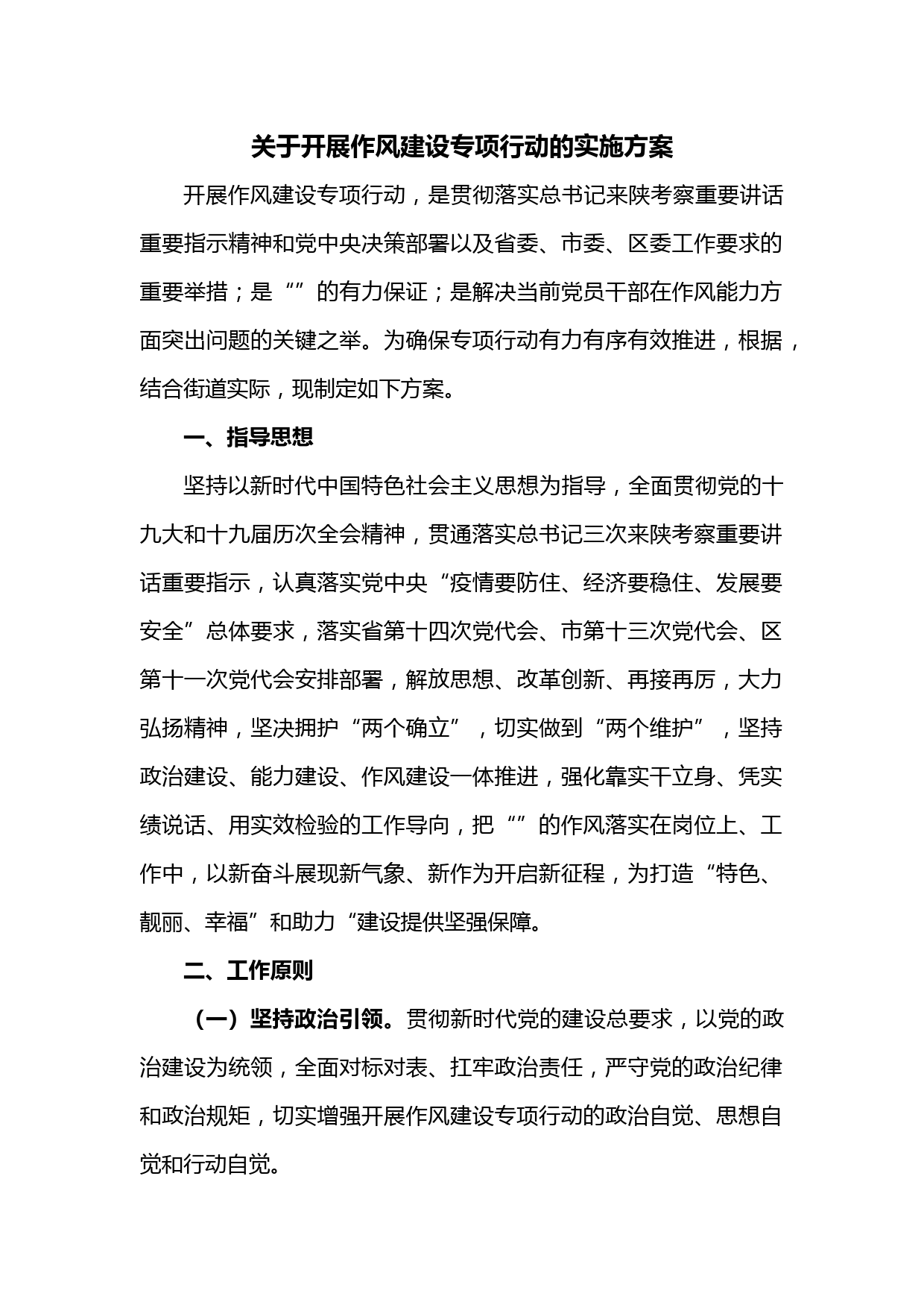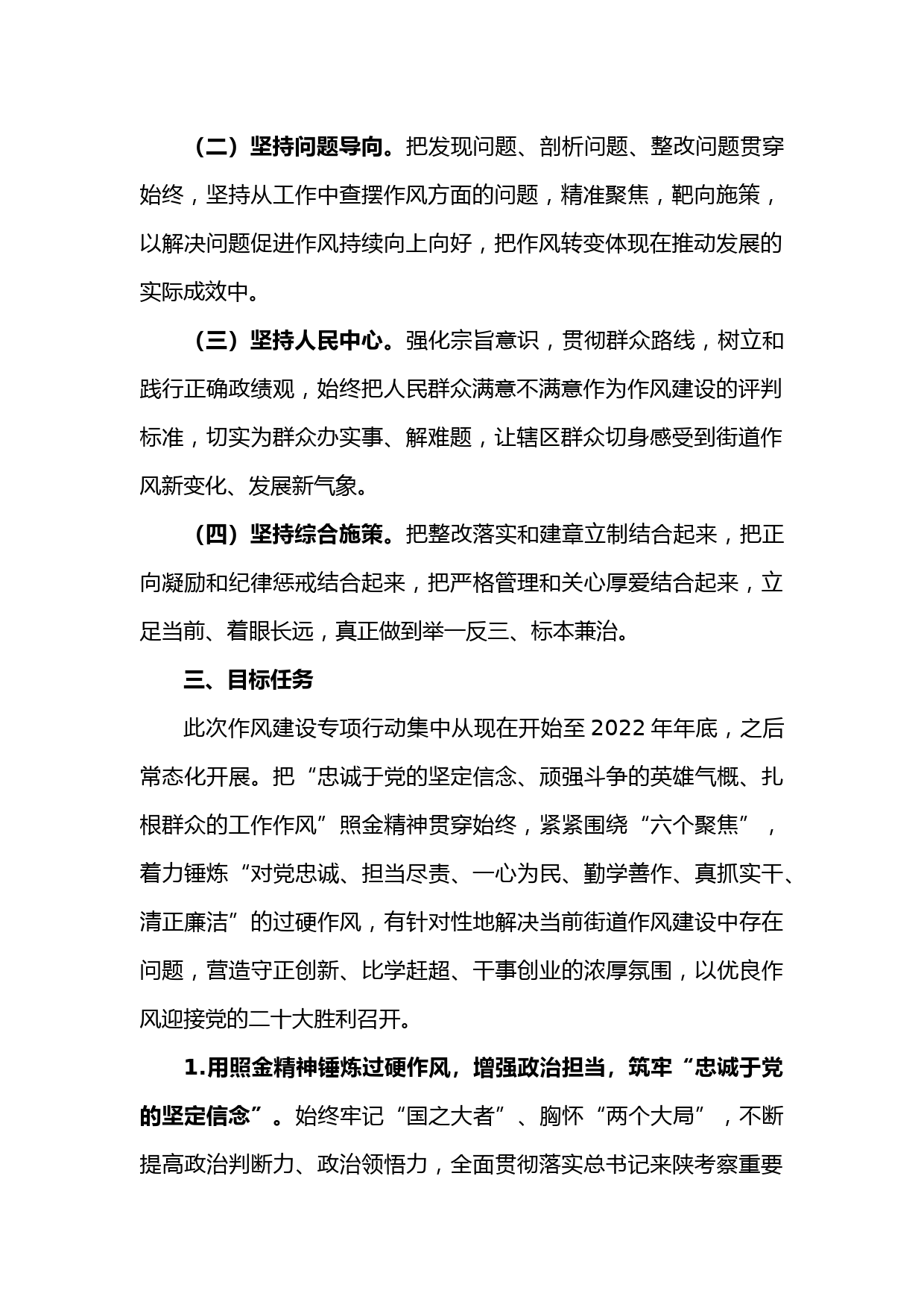 關(guān)于開展作風(fēng)建設(shè)專項行動的實施方案開展作風(fēng)建設(shè)專項行動,是貫徹落實總書記來陜考察重要講話重要指示精神和黨中央決策部署以及省委、市委、區(qū)委工作要求的重要舉措;是“”的有力保證;是解決當(dāng)前黨員干部在作風(fēng)能力方面突出問題的關(guān)鍵之舉。為確保專項行動有力有序有效推進,根據(jù),結(jié)合街道實際,現(xiàn)制定如下方案。一、指導(dǎo)思想堅持以新時代中國特色社會主義思想為指導(dǎo),全面貫徹黨的十九大和十九屆歷次全會精神,貫通落實總書記三次來陜考察重要講話重要指示,認(rèn)真落實黨中央“疫情要防住、經(jīng)濟要穩(wěn)住、發(fā)展要安全”總體要求,落實省第十四次黨代會、市第十三次黨代會...