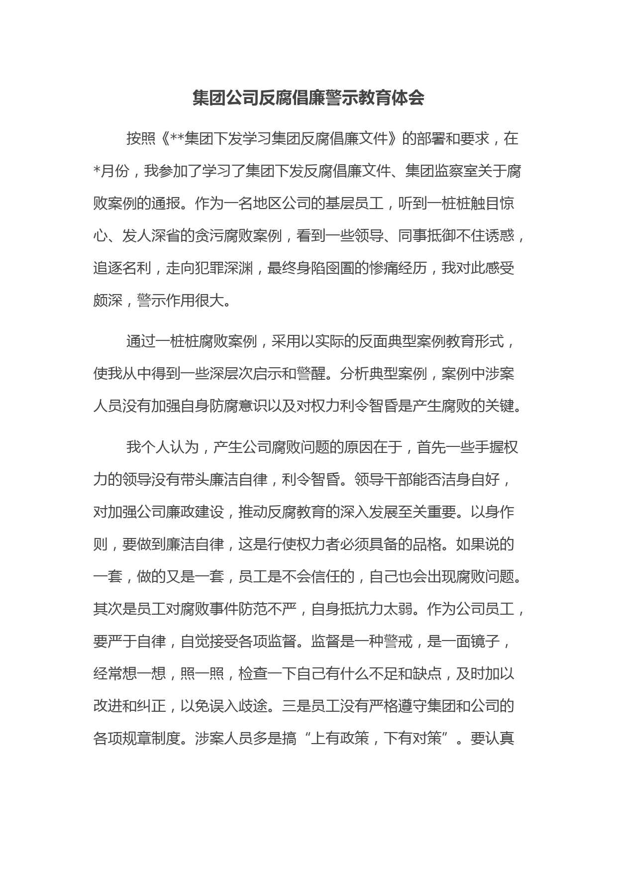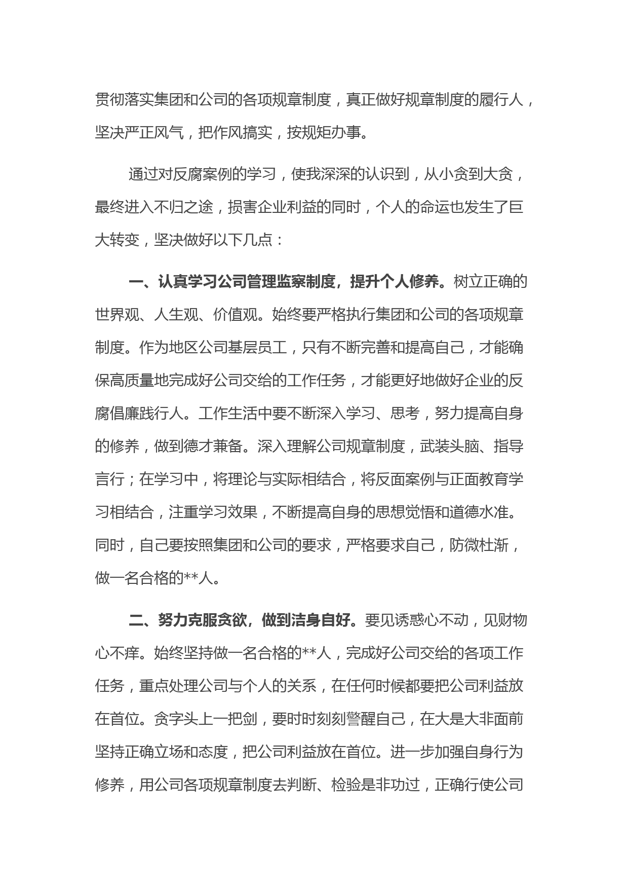 集團公司反腐倡廉警示教育體會按照《集團下發(fā)學習集團反腐倡廉文件》的部署和要求,在月份,我參加了學習了集團下發(fā)反腐倡廉文件、集團監(jiān)察室關于腐敗案例的通報。作為一名地區(qū)公司的基層員工,聽到一樁樁觸目驚心、發(fā)人深省的貪污腐敗案例,看到一些領導、同事抵御不住誘惑,追逐名利,走向犯罪深淵,最終身陷囹圄的慘痛經(jīng)歷,我對此感受頗深,警示作用很大。通過一樁樁腐敗案例,采用以實際的反面典型案例教育形式,使我從中得到一些深層次啟示和警醒。分析典型案例,案例中涉案人員沒有加強自身防腐意識以及對權力利令智昏是產(chǎn)生腐敗的關鍵。我個人認為,產(chǎn)生公司腐敗...
