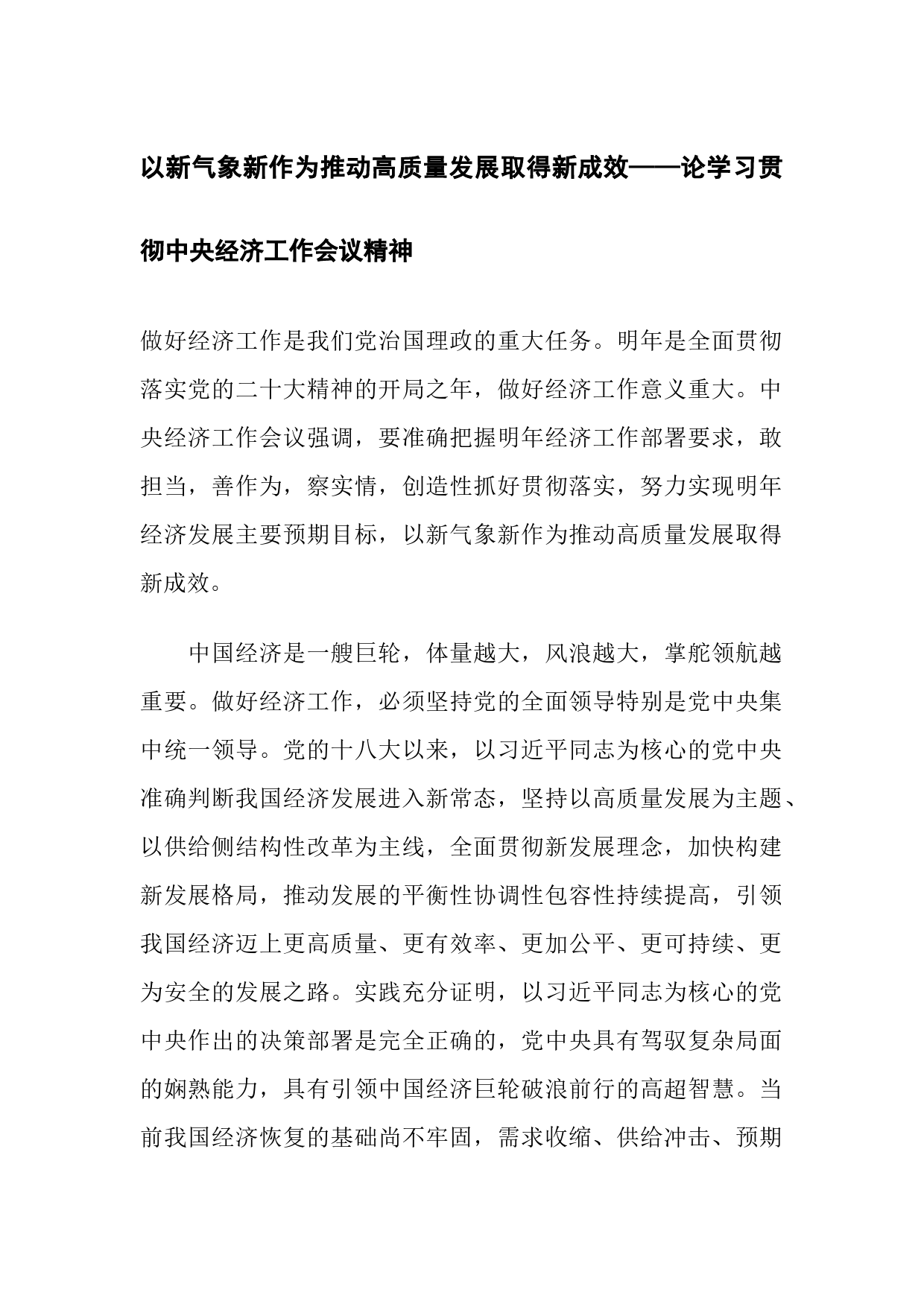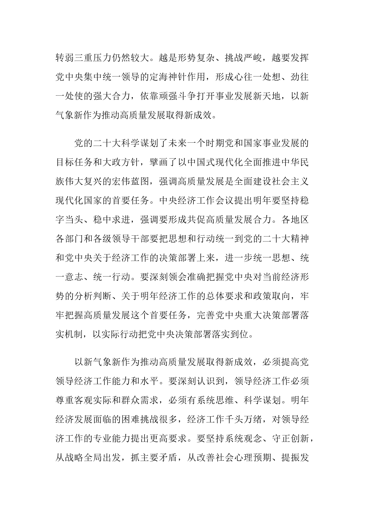 以新氣象新作為推動(dòng)高質(zhì)量發(fā)展取得新成效——論學(xué)習(xí)貫徹中央經(jīng)濟(jì)工作會(huì)議精神做好經(jīng)濟(jì)工作是我們黨治國理政的重大任務(wù)。明年是全面貫徹落實(shí)黨的二十大精神的開局之年,做好經(jīng)濟(jì)工作意義重大。中央經(jīng)濟(jì)工作會(huì)議強(qiáng)調(diào),要準(zhǔn)確把握明年經(jīng)濟(jì)工作部署要求,敢擔(dān)當(dāng),善作為,察實(shí)情,創(chuàng)造性抓好貫徹落實(shí),努力實(shí)現(xiàn)明年經(jīng)濟(jì)發(fā)展主要預(yù)期目標(biāo),以新氣象新作為推動(dòng)高質(zhì)量發(fā)展取得新成效。中國經(jīng)濟(jì)是一艘巨輪,體量越大,風(fēng)浪越大,掌舵領(lǐng)航越重要。做好經(jīng)濟(jì)工作,必須堅(jiān)持黨的全面領(lǐng)導(dǎo)特別是黨中央集中統(tǒng)一領(lǐng)導(dǎo)。黨的十八大以來,以習(xí)近平同志為核心的黨中央準(zhǔn)確判斷我國經(jīng)濟(jì)發(fā)展進(jìn)...