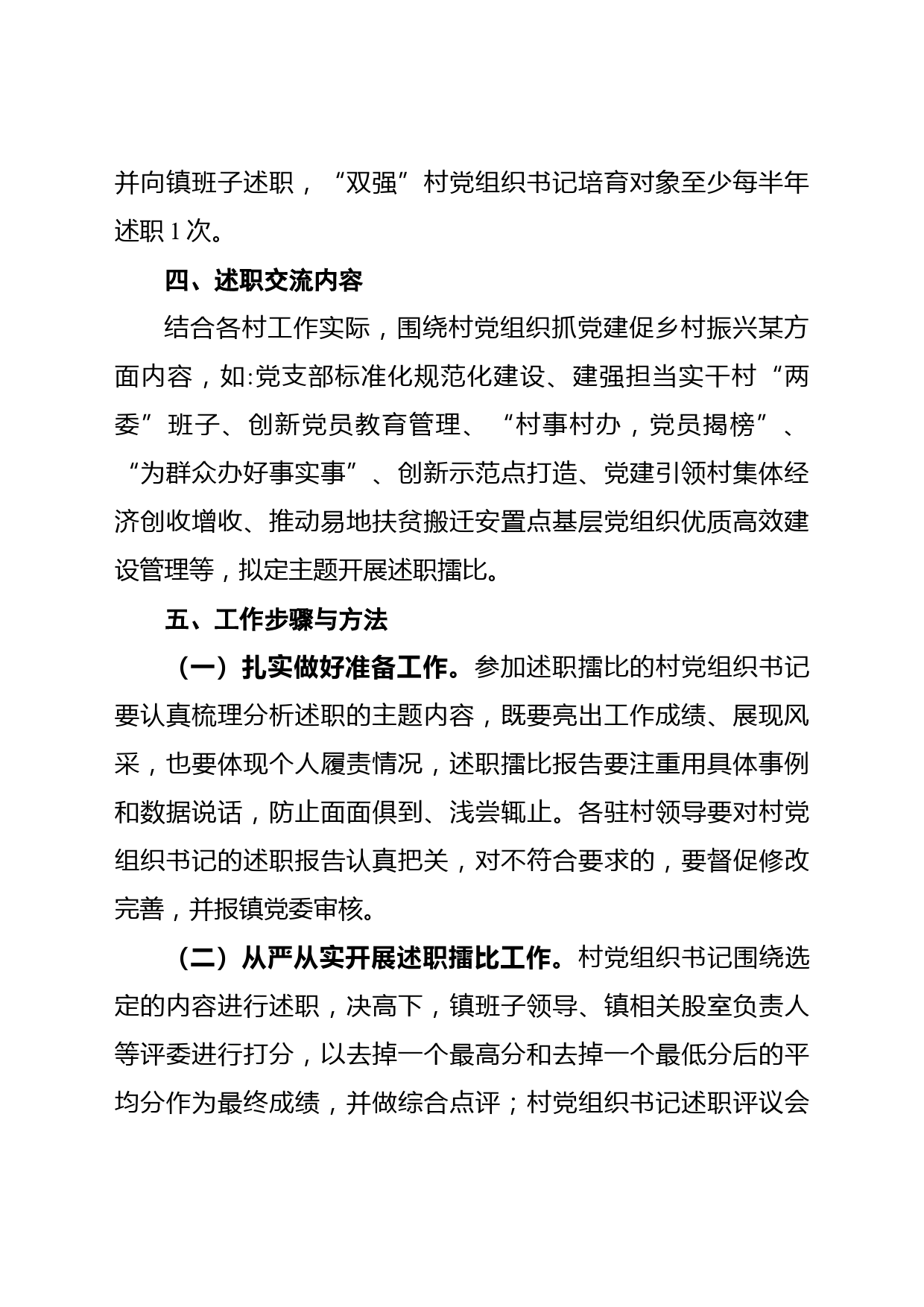 2022年抓黨建促鄉(xiāng)村振興擂臺比武活動實施方案為進一步貫徹落實《x市基層黨建“提質(zhì)聚力”鞏固提升行動方案》,堅持以村(居)黨組織書記隊伍質(zhì)量整體提升為目標,鞏固拓展x市黨組織建設“頭羊計劃”成果,著力打造一支黨性強、能力強的“雙強”黨組織帶頭人隊伍。結合我鎮(zhèn)工作實際,制定如下方案。一、目標任務全面實施鄉(xiāng)村振興“雙強”基層黨組織工作計劃,堅持抓黨建促鄉(xiāng)村振興,靈活黨組織書記培育方式,讓優(yōu)秀的村黨組織書記有亮成績、展風采的舞臺,并在這個舞臺中找差距、補不足,相互借鑒,形成比學趕超的濃厚氛圍,推動村級黨組織書記綜合能力全面提升。二、時間...