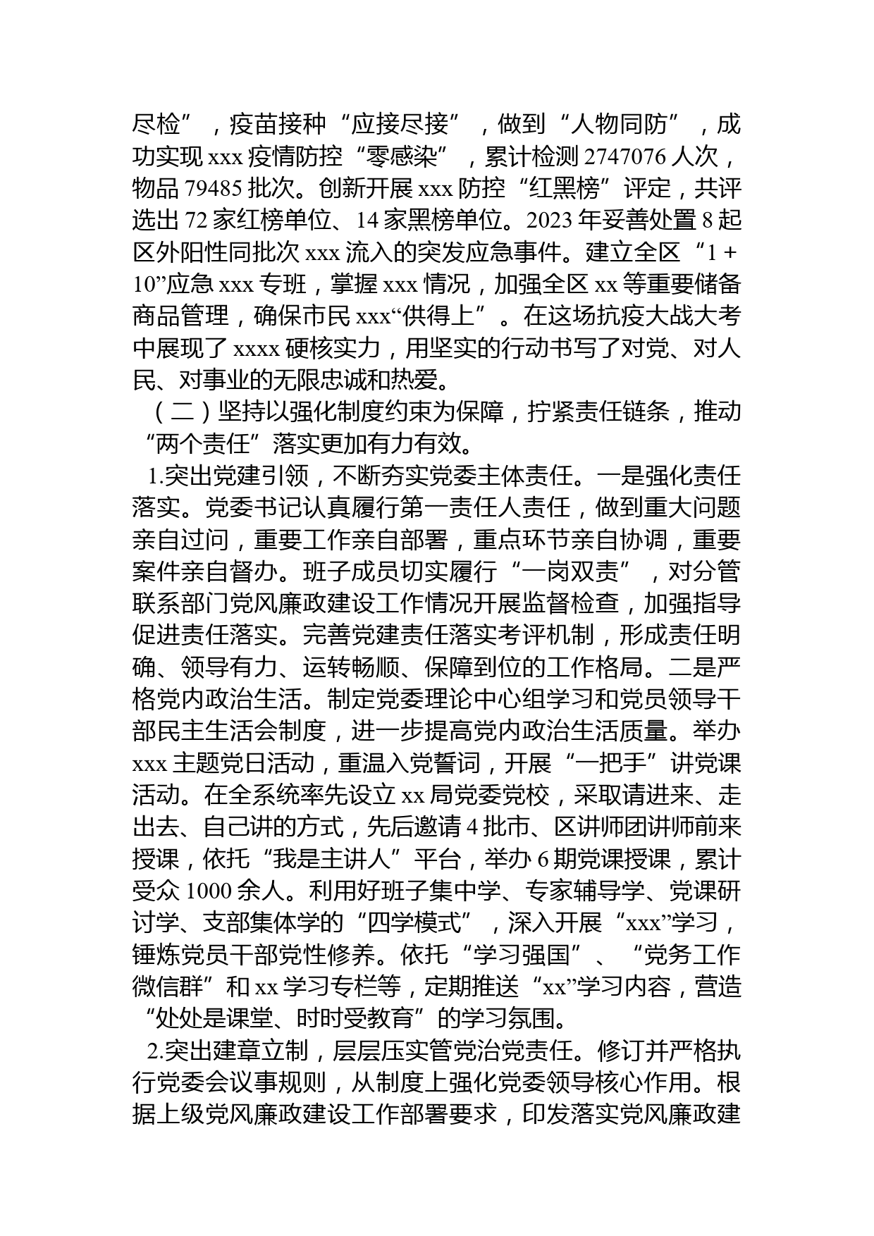 xx局2022年黨風(fēng)廉政建設(shè)工作情況和2023年工作計(jì)劃2022年是黨的xx大勝利召開(kāi)之年,也是“十四五”規(guī)劃和第二個(gè)一百年奮斗目標(biāo)的承前啟后之年。xx局黨委堅(jiān)持以習(xí)近平新時(shí)代中國(guó)特色社會(huì)主義思想為引領(lǐng),深入貫徹落實(shí)黨的XX大精神,認(rèn)真落實(shí)市局黨組和區(qū)紀(jì)委監(jiān)委各項(xiàng)決策部署,增強(qiáng)“四個(gè)意識(shí)”、堅(jiān)定“四個(gè)自信”、做到“兩個(gè)維護(hù)”,忠誠(chéng)履職、主動(dòng)作為,堅(jiān)定不移推進(jìn)全面從嚴(yán)治黨向縱深發(fā)展,黨風(fēng)廉政建設(shè)和反腐敗工作取得新成效。一、2022年工作情況(一)堅(jiān)持以黨的政治建設(shè)為統(tǒng)領(lǐng),強(qiáng)化理論武裝,推動(dòng)廣大黨員干部用實(shí)際行動(dòng)踐行初心使命。1.在持續(xù)學(xué)思踐悟中把握精髓...