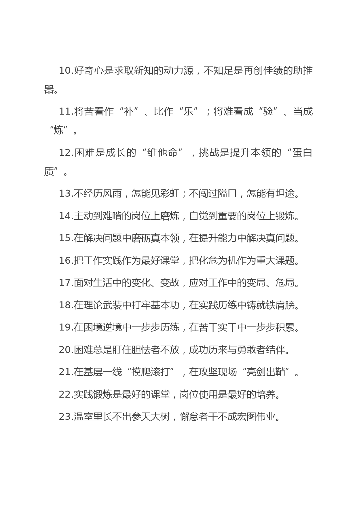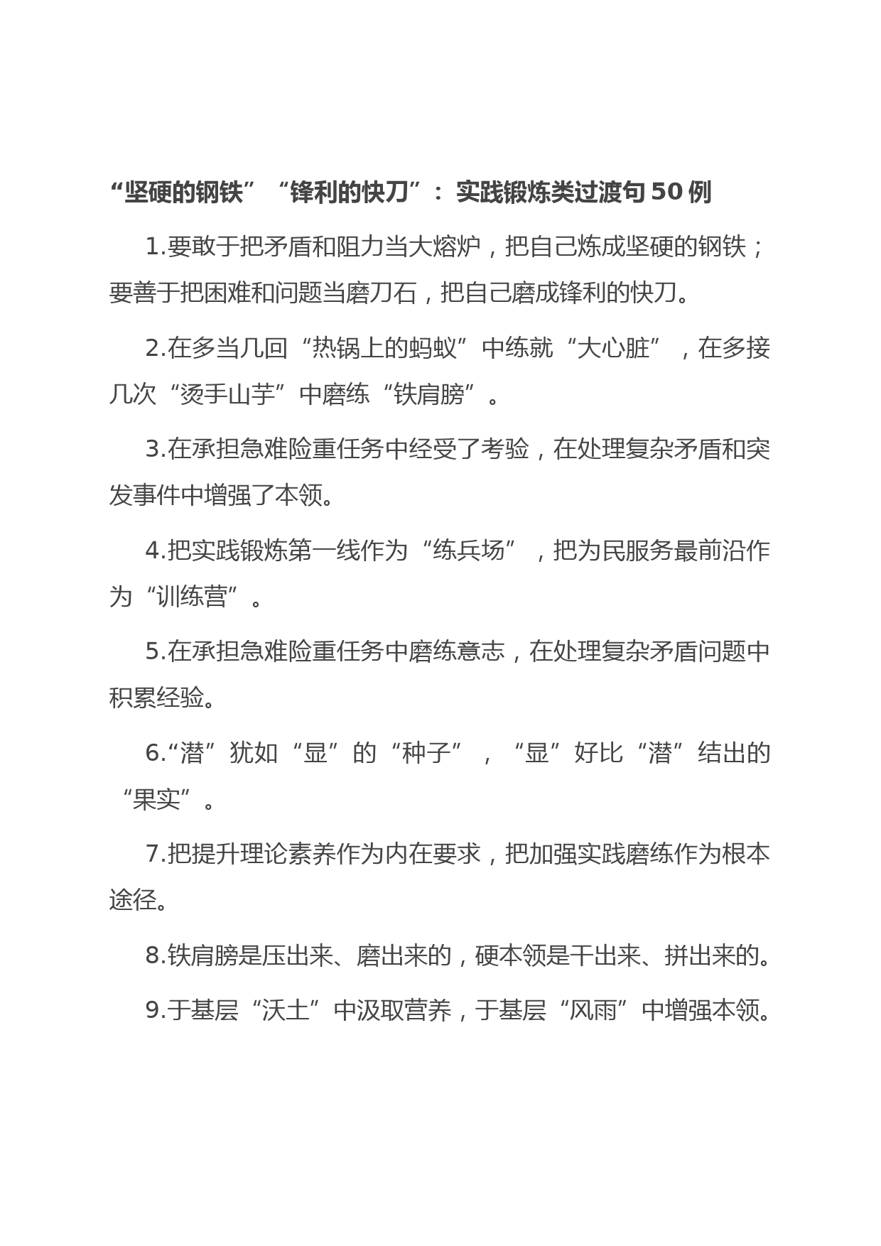 “堅(jiān)硬的鋼鐵”“鋒利的快刀”:實(shí)踐鍛煉類過渡句50例1.要敢于把矛盾和阻力當(dāng)大熔爐,把自己煉成堅(jiān)硬的鋼鐵;要善于把困難和問題當(dāng)磨刀石,把自己磨成鋒利的快刀。2.在多當(dāng)幾回“熱鍋上的螞蟻”中練就“大心臟”,在多接幾次“燙手山芋”中磨練“鐵肩膀”。3.在承擔(dān)急難險重任務(wù)中經(jīng)受了考驗(yàn),在處理復(fù)雜矛盾和突發(fā)事件中增強(qiáng)了本領(lǐng)。4.把實(shí)踐鍛煉第一線作為“練兵場”,把為民服務(wù)最前沿作為“訓(xùn)練營”。5.在承擔(dān)急難險重任務(wù)中磨練意志,在處理復(fù)雜矛盾問題中積累經(jīng)驗(yàn)。6.“潛”猶如“顯”的“種子”,“顯”好比“潛”結(jié)出的“果實(shí)”。7.把提升理論素養(yǎng)作為內(nèi)在要求,...