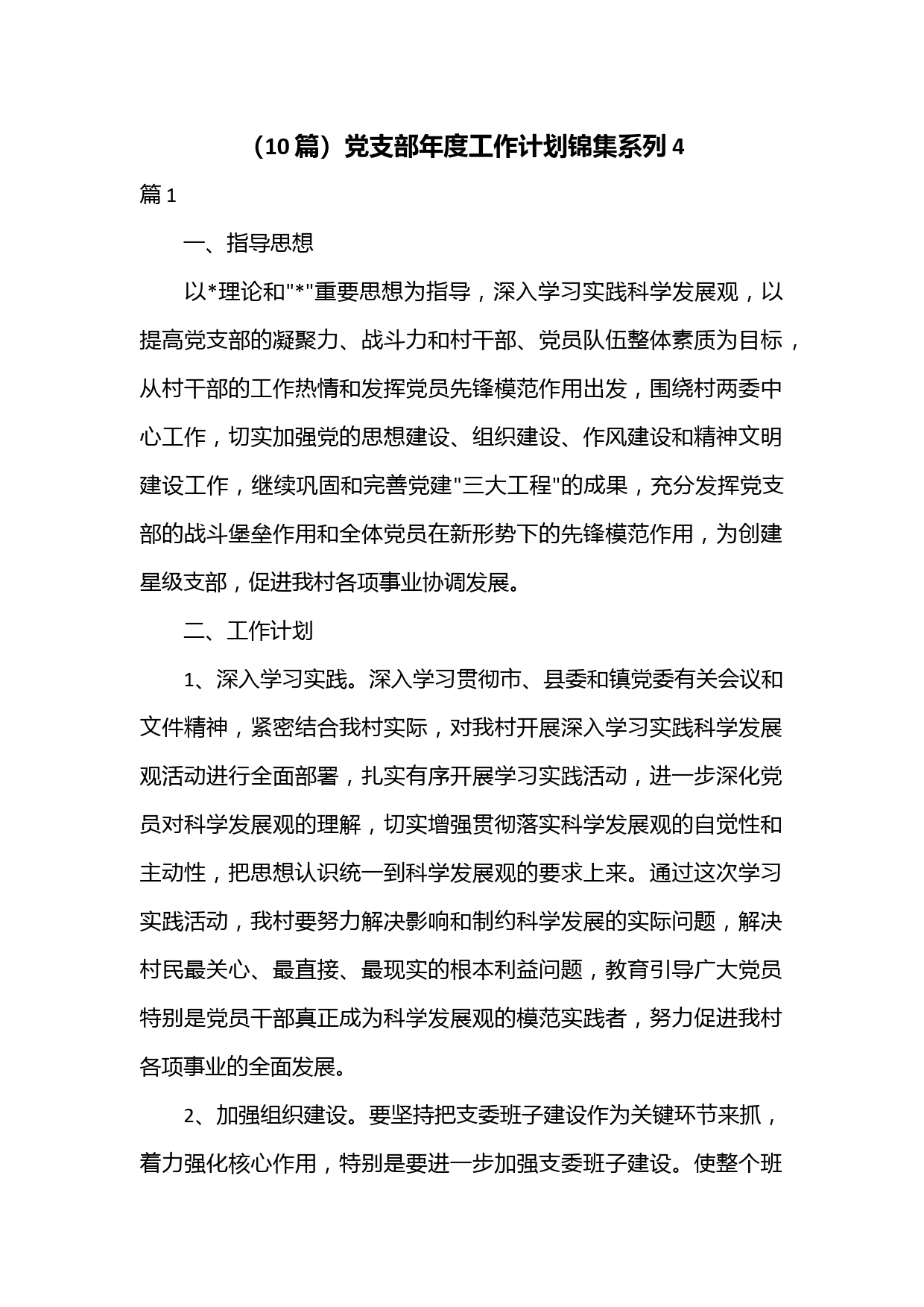 (10篇)黨支部年度工作計劃錦集系列4篇1一、指導(dǎo)思想以理論和""重要思想為指導(dǎo),深入學(xué)習(xí)實踐科學(xué)發(fā)展觀,以提高黨支部的凝聚力、戰(zhàn)斗力和村干部、黨員隊伍整體素質(zhì)為目標(biāo),從村干部的工作熱情和發(fā)揮黨員先鋒模范作用出發(fā),圍繞村兩委中心工作,切實加強黨的思想建設(shè)、組織建設(shè)、作風(fēng)建設(shè)和精神文明建設(shè)工作,繼續(xù)鞏固和完善黨建"三大工程"的成果,充分發(fā)揮黨支部的戰(zhàn)斗堡壘作用和全體黨員在新形勢下的先鋒模范作用,為創(chuàng)建星級支部,促進我村各項事業(yè)協(xié)調(diào)發(fā)展。二、工作計劃1、深入學(xué)習(xí)實踐。深入學(xué)習(xí)貫徹市、縣委和鎮(zhèn)黨委有關(guān)會議和文件精神,緊密結(jié)合我村實際,對我...