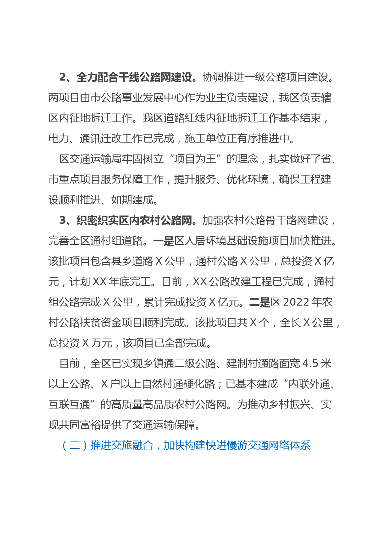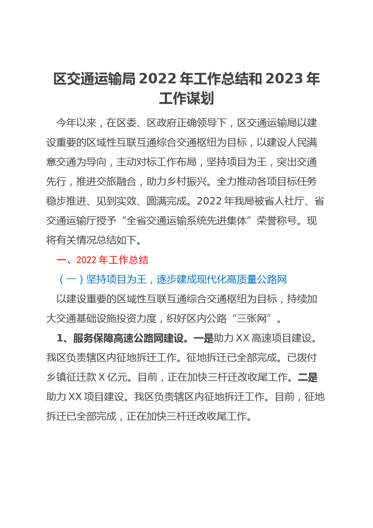區(qū)交通運(yùn)輸局2022年工作總結(jié)和2023年工作謀劃今年以來,在區(qū)委、區(qū)政府正確領(lǐng)導(dǎo)下,區(qū)交通運(yùn)輸局以建設(shè)重要的區(qū)域性互聯(lián)互通綜合交通樞紐為目標(biāo),以建設(shè)人民滿意交通為導(dǎo)向,主動(dòng)對(duì)標(biāo)工作布局,堅(jiān)持項(xiàng)目為王,突出交通先行,推進(jìn)交旅融合,助力鄉(xiāng)村振興。全力推動(dòng)各項(xiàng)目標(biāo)任務(wù)穩(wěn)步推進(jìn)、見到實(shí)效、圓滿完成。2022年我局被省人社廳、省交通運(yùn)輸廳授予“全省交通運(yùn)輸系統(tǒng)先進(jìn)集體”榮譽(yù)稱號(hào)?,F(xiàn)將有關(guān)情況總結(jié)如下。一、2022年工作總結(jié)(一)堅(jiān)持項(xiàng)目為王,逐步建成現(xiàn)代化高質(zhì)量公路網(wǎng)以建設(shè)重要的區(qū)域性互聯(lián)互通綜合交通樞紐為目標(biāo),持續(xù)加大交通基礎(chǔ)設(shè)施投資力度,織好區(qū)...
