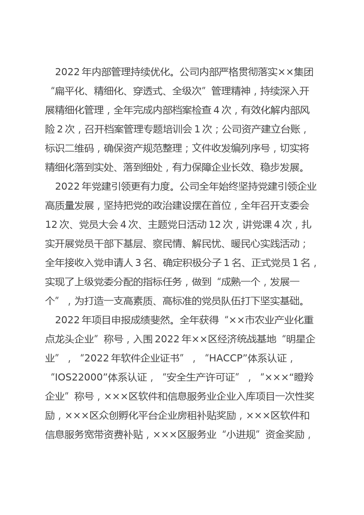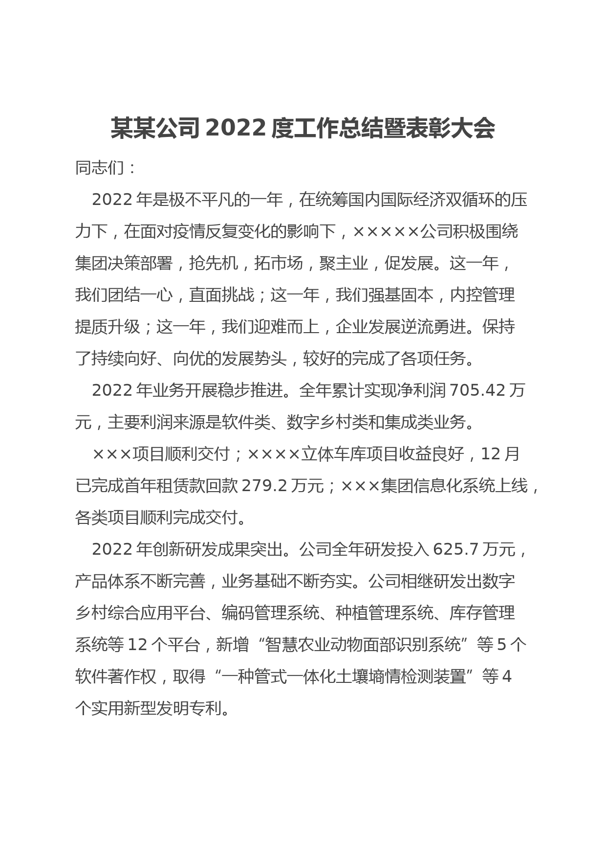 某某公司2022度工作總結暨表彰大會同志們:2022年是極不平凡的一年,在統(tǒng)籌國內國際經(jīng)濟雙循環(huán)的壓力下,在面對疫情反復變化的影響下,×××××公司積極圍繞集團決策部署,搶先機,拓市場,聚主業(yè),促發(fā)展。這一年,我們團結一心,直面挑戰(zhàn);這一年,我們強基固本,內控管理提質升級;這一年,我們迎難而上,企業(yè)發(fā)展逆流勇進。保持了持續(xù)向好、向優(yōu)的發(fā)展勢頭,較好的完成了各項任務。2022年業(yè)務開展穩(wěn)步推進。全年累計實現(xiàn)凈利潤705.42萬元,主要利潤來源是軟件類、數(shù)字鄉(xiāng)村類和集成類業(yè)務?!痢痢另椖宽樌桓叮弧痢痢痢亮Ⅲw車庫項目收益良好,12月已完成首年租賃款...