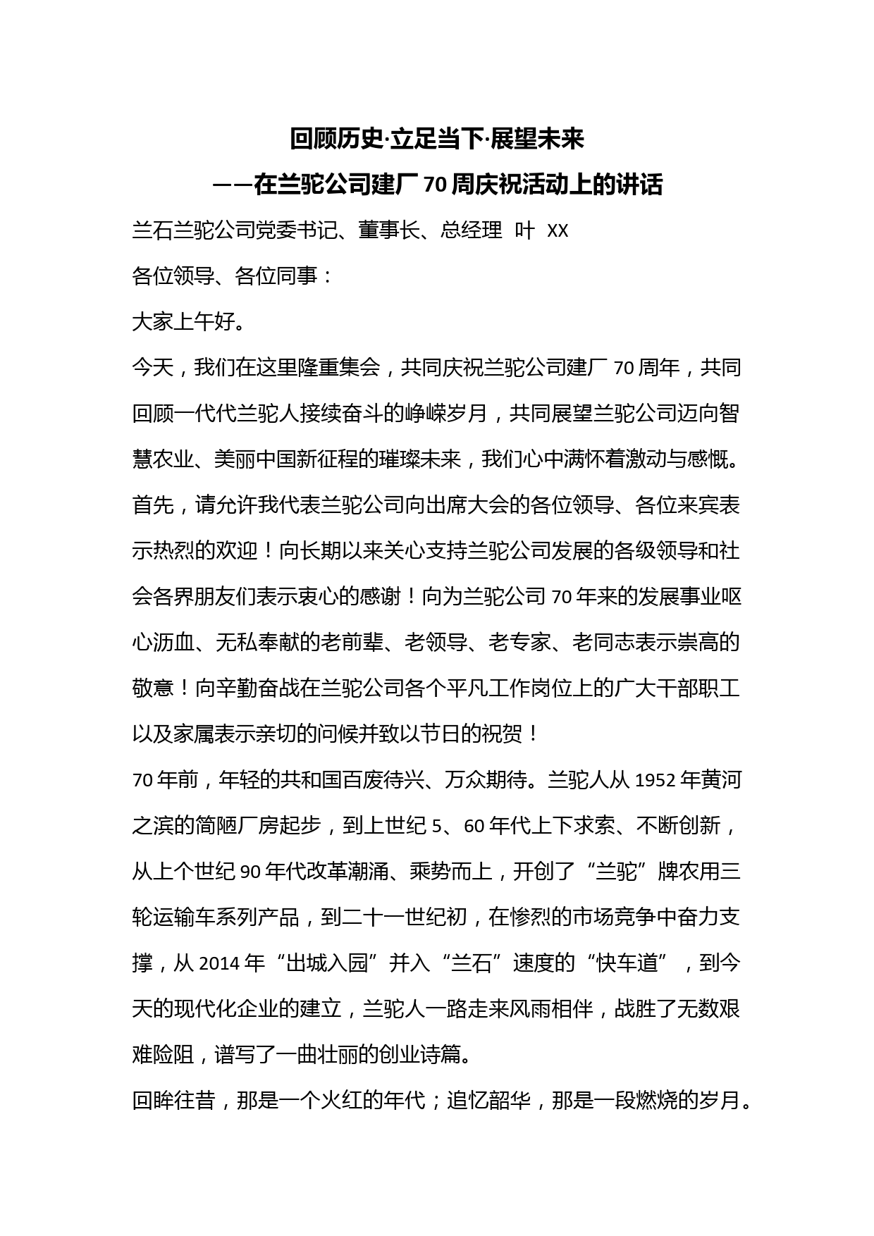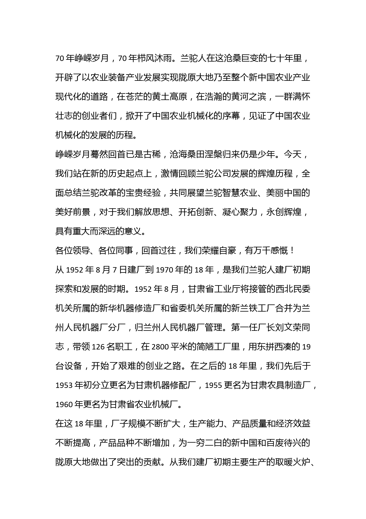 回顧歷史·立足當(dāng)下·展望未來(lái)——在蘭駝公司建廠70周慶?;顒?dòng)上的講話蘭石蘭駝公司黨委書記、董事長(zhǎng)、總經(jīng)理葉XX各位領(lǐng)導(dǎo)、各位同事:大家上午好。今天,我們?cè)谶@里隆重集會(huì),共同慶祝蘭駝公司建廠70周年,共同回顧一代代蘭駝人接續(xù)奮斗的崢嶸歲月,共同展望蘭駝公司邁向智慧農(nóng)業(yè)、美麗中國(guó)新征程的璀璨未來(lái),我們心中滿懷著激動(dòng)與感慨。首先,請(qǐng)?jiān)试S我代表蘭駝公司向出席大會(huì)的各位領(lǐng)導(dǎo)、各位來(lái)賓表示熱烈的歡迎!向長(zhǎng)期以來(lái)關(guān)心支持蘭駝公司發(fā)展的各級(jí)領(lǐng)導(dǎo)和社會(huì)各界朋友們表示衷心的感謝!向?yàn)樘m駝公司70年來(lái)的發(fā)展事業(yè)嘔心瀝血、無(wú)私奉獻(xiàn)的老前輩、老領(lǐng)導(dǎo)、老專家、...